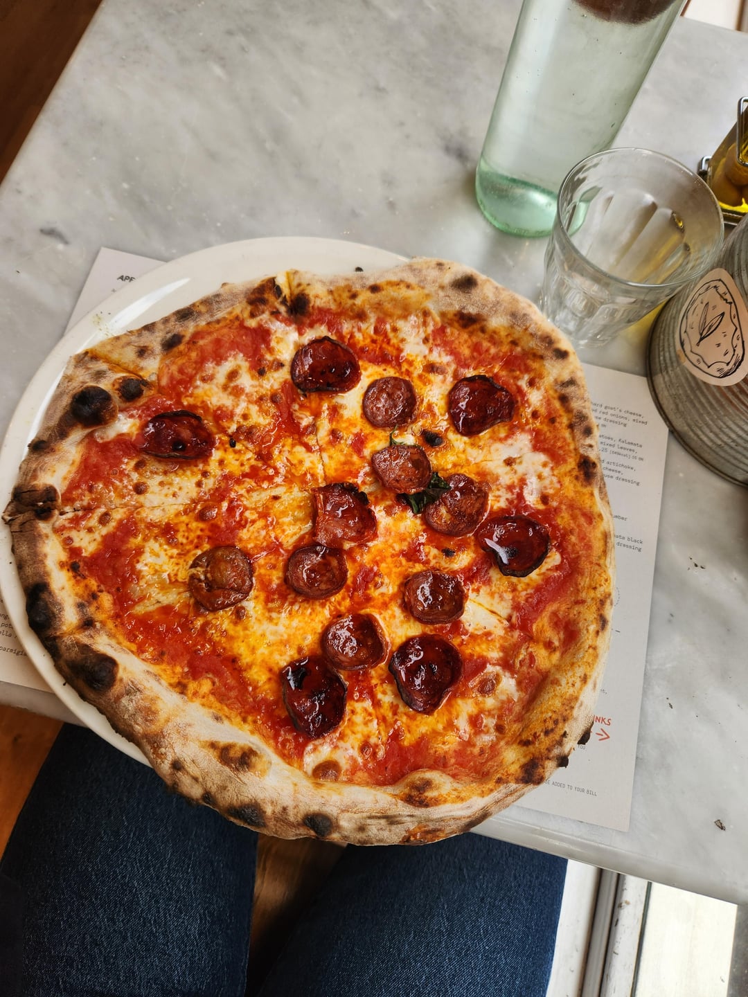 The restaurant menu states 802 calories but I've heard the calories restaurants state can be real off? It's a sourdough pizza with Cured Iberico chorizo (dry & semi-dry), organic tomatos & mozzarella.
