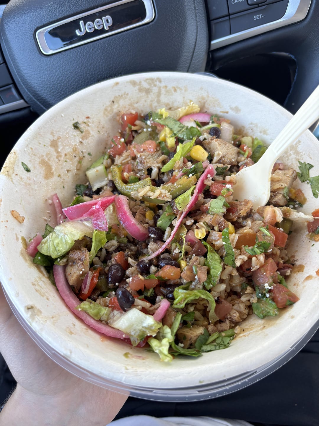 QDOBA did me right!! Why does anyone go to Chipotle anymore?? Order was a bowl with brown rice, black beans, chicken, extra fajita veggies, extra lettuce, mild salsa, medium salsa, pico, light fire roasted corn, cilantro, and pickled red onions. Absolutely delicious 🤤