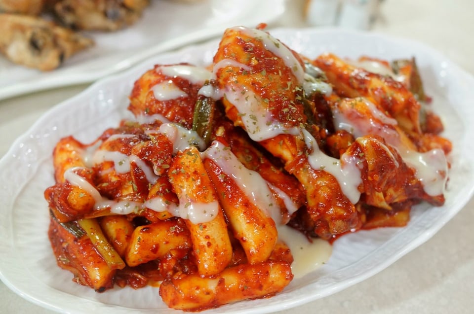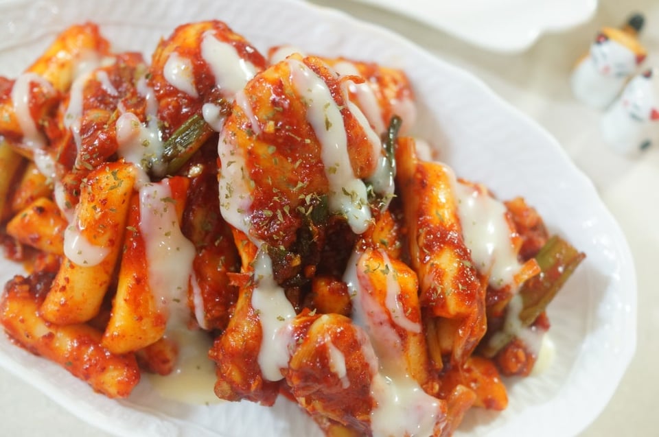 1️⃣ **Pan-sear chicken** (2 min), then cook covered on low heat (15 min). 2️⃣ **Add green onions**, stir-fry until charred, then pan-fry rice cakes. 3️⃣ **Mix in sauce**, let caramelize for 2 min, then cover for 1 min. 4️⃣ **Drizzle with sweet mayo** and serve hot!