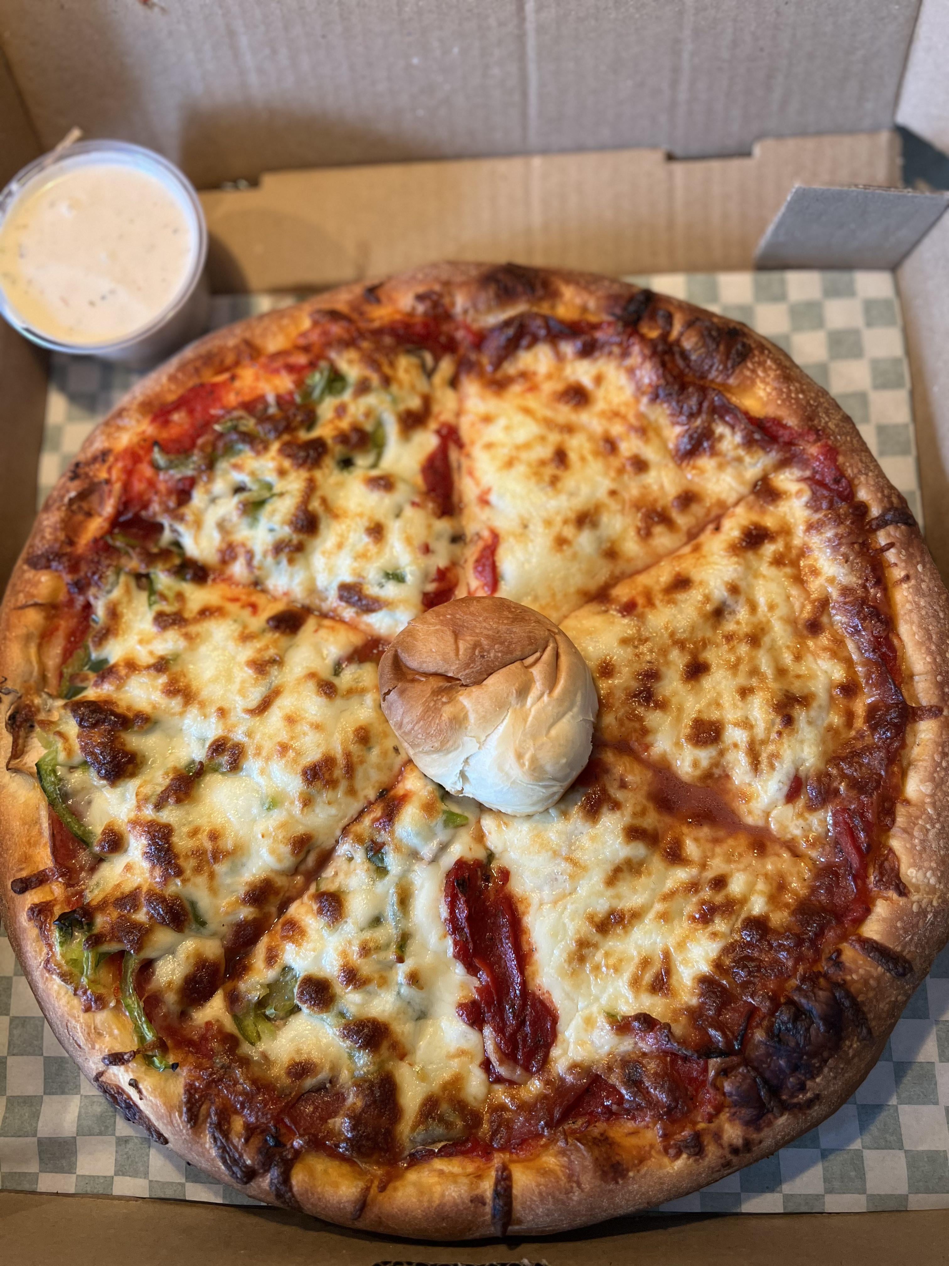 What does all dressed mean? And you’re dipping your pizza into salad dressing?