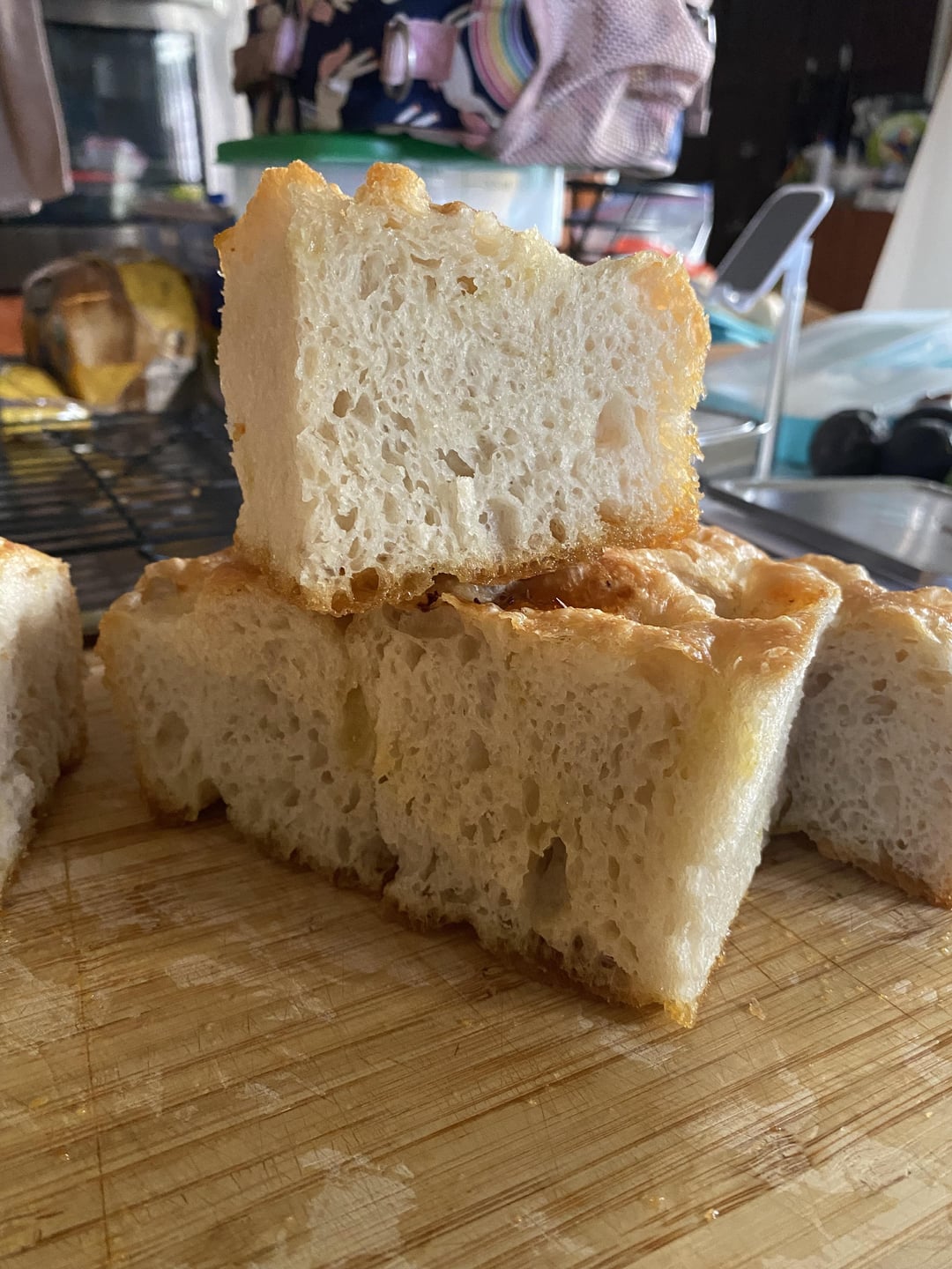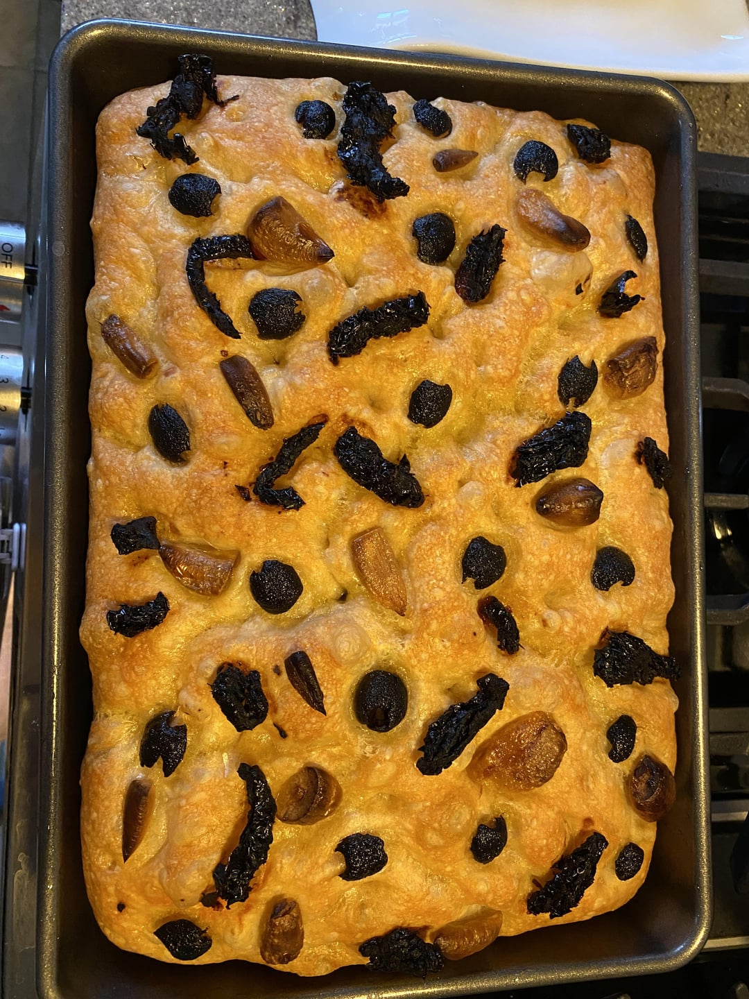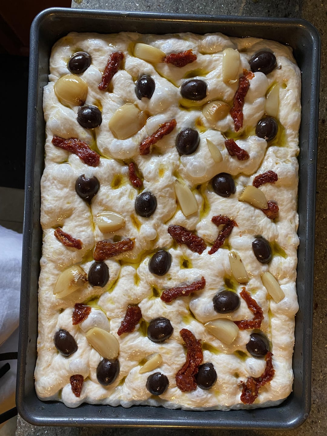 I used a 9 x 14 pan, which I now realize was too small lol, and all my toppings burned midway through the bake. If I were to do this again, I would probably use a large sheet pan, given the size of the dough. I think maybe I was supposed to press in the toppings? I just laid them gently on top, so when they burned, I was able to just pick them off and eat the focaccia plain. It was still tasty!