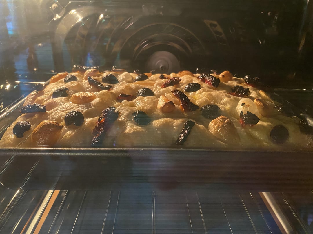 Everyone else’s comments are super helpful! Just wanted throw in what we do at the bakery I work at – we put another sheet pan face down on top of the foccacia, to act as a lid while we bake it. We take it off during the last few minutes to provide more browning on the top and avoid burning the ingredients. We also oil all our toppings before they go onto the foccacia to help prevent them from drying out!