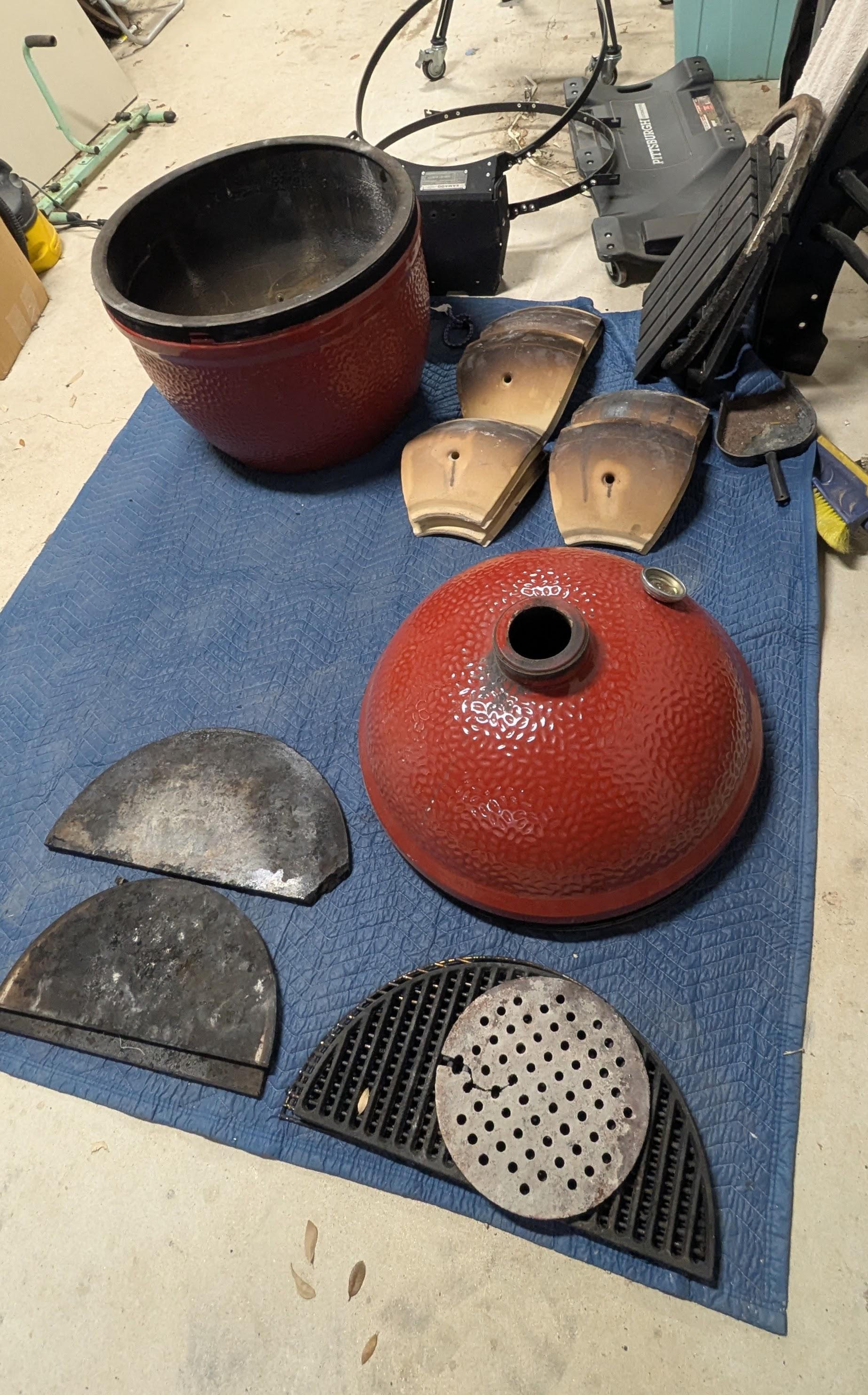 Yesterday, I posted asking if anyone here thought my wife and i could move this big joe into my truck for transport after purchasing it on Marketplace for $500. The resounding answer was, not just “no”, but “Hell no”. After much deliberation, I reduced it down to its smallest components and loaded it up in the truck bed and back seat. Overall, the process went really smooth and there was almost no stress. The only issues with this grill appear to be the fire box base being broken in half and the hinge may have a slight issue. It was dark, so it was hard to inspect it too close, but I’ll know more when I get it back together tonight. Either way, it came with a cast iron grate and a “gently used” soap stone. I dont appear to have an accessory rack either, so I’ll be placing an amazon order tonight to get that coming along with a proper ash bucket and a charcoal basket.
