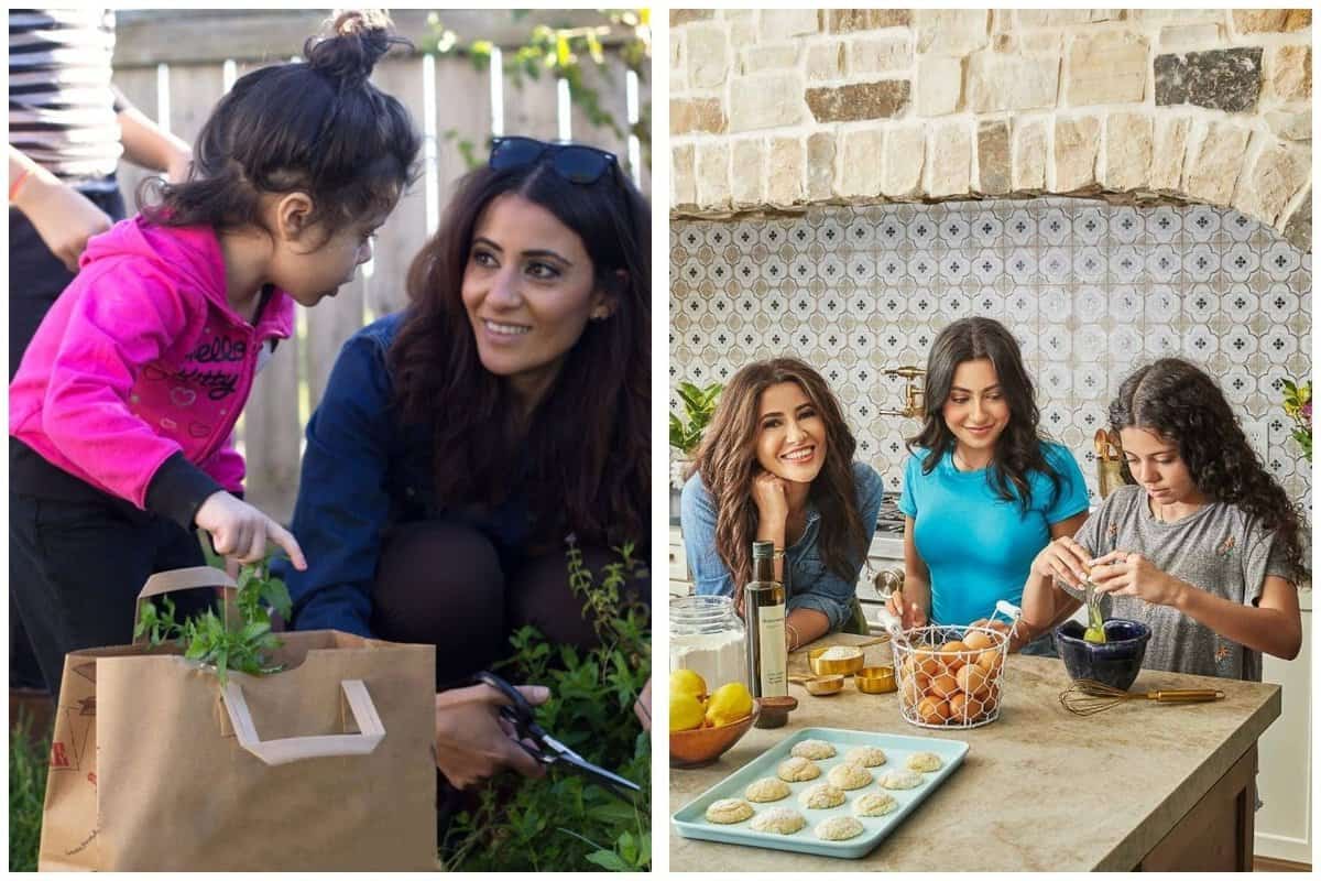 Photo 1: Picking herbs with little Hannah in 2014; Photo 2: Me and my girls, Dara and Hannah, in a photo from my second cookbook in 2024!