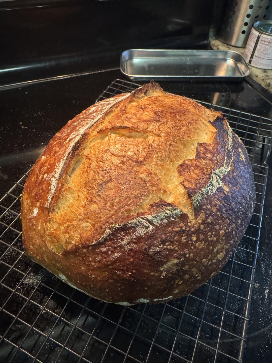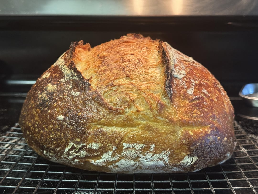 3Hr Autolyse, mostly KABF with some whole wheat in the mix. 80% hydration dough, 25% Leavener. Folds and bulk ferment was about 6Hr then gentle shaping and cold ferment for 14 hr. Dutch oven used.