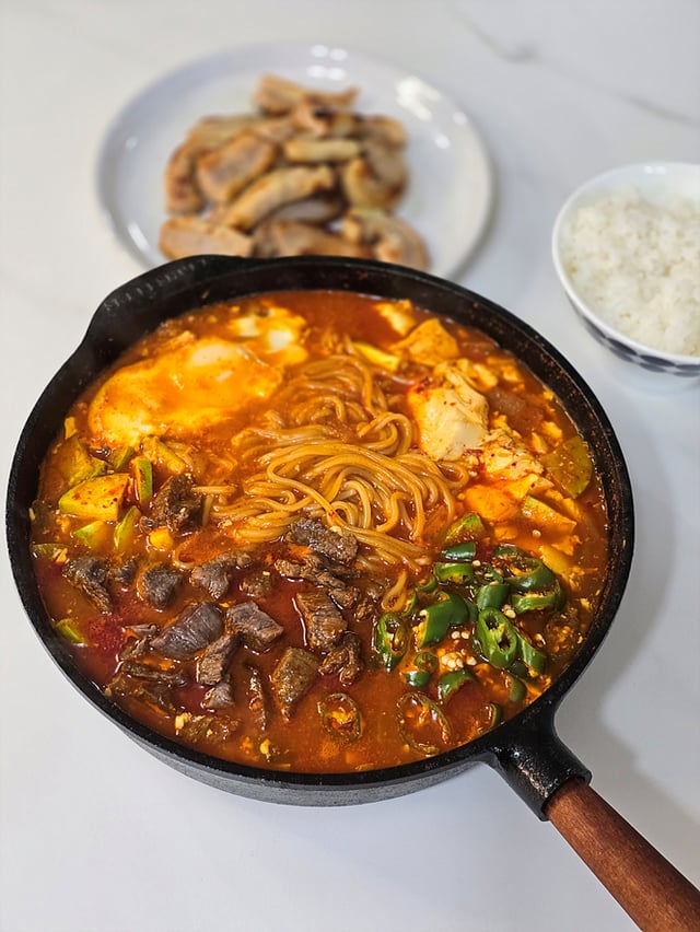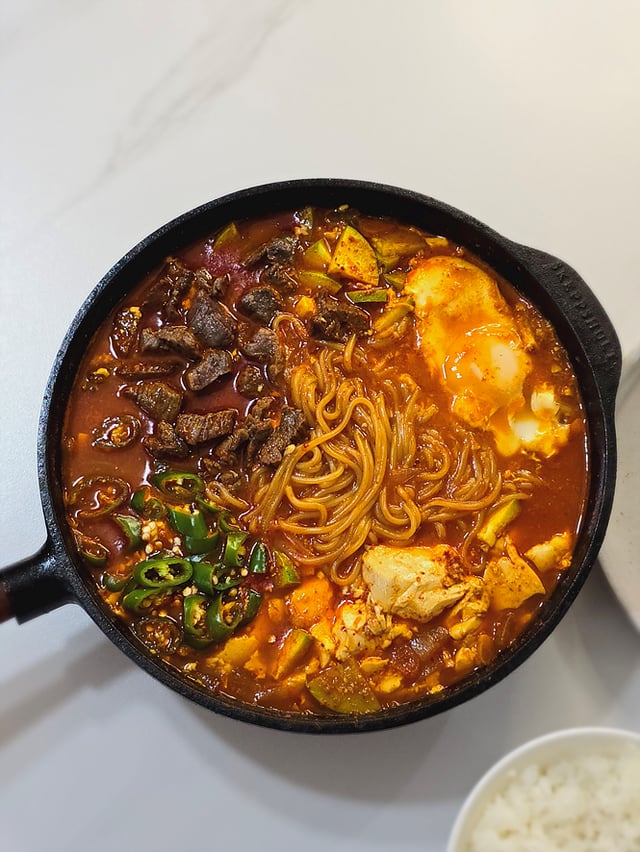 1️⃣ **Sear beef**, set aside. Stir-fry **onions & green onions**, then add gochugaru. 2️⃣ **Pour in water**, add seasonings, and bring to a boil. 3️⃣ **Add soft tofu & jjolmyeon noodles**, breaking them apart. 4️⃣ **Return beef, add zucchini & green chili**, then crack in an egg. 5️⃣ **Simmer until noodles are cooked & enjoy!**