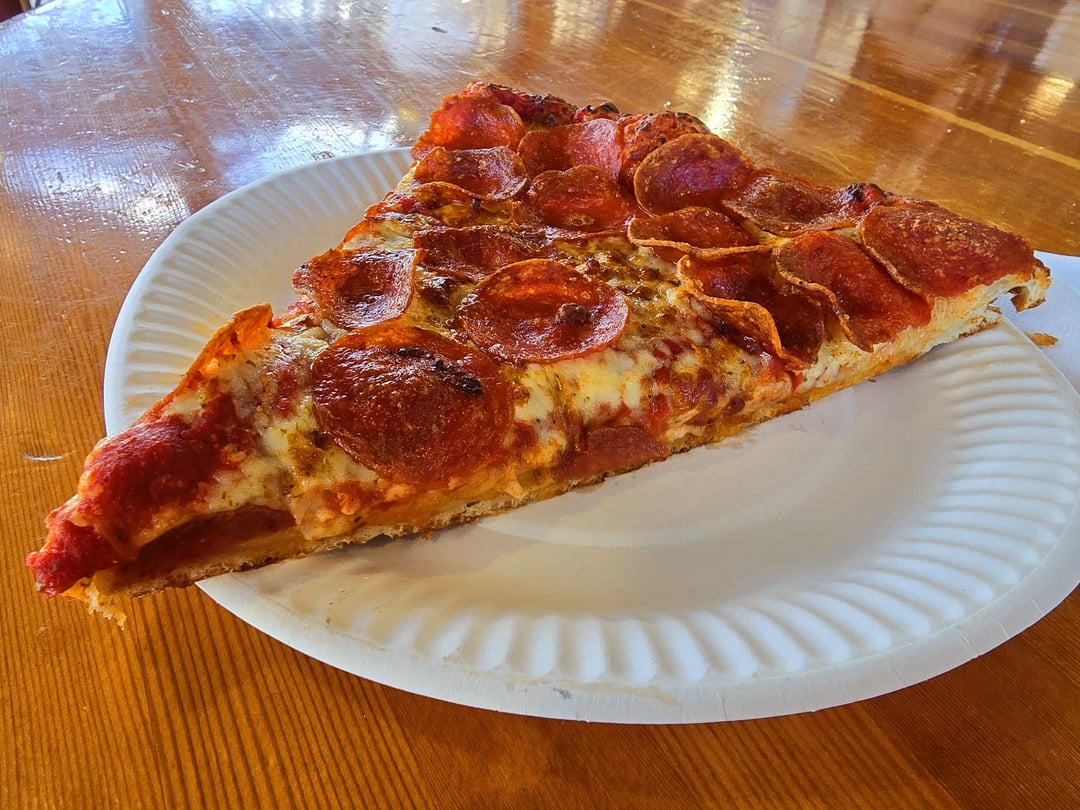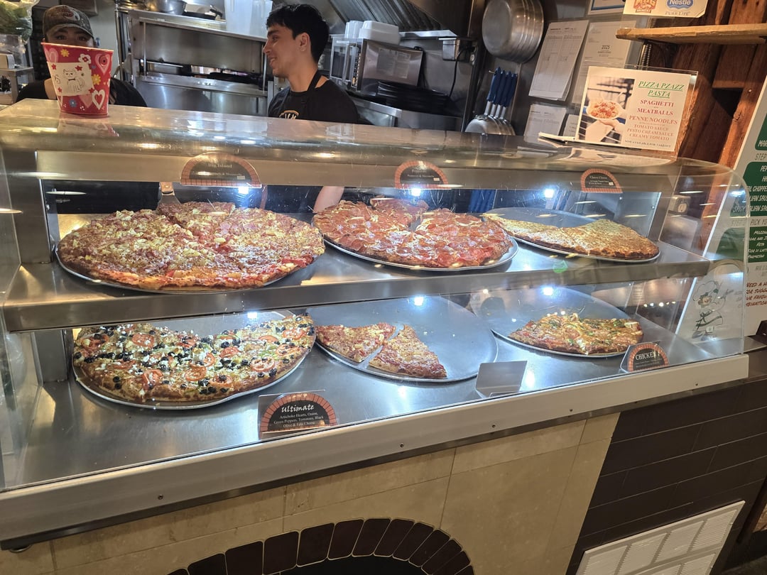 Pzazz at Granville Market in Vancouver BC Canada. Excellent slice! Tangy sauce, not overloaded with cheese, crispy crust, and so thick! Highly recommended.
