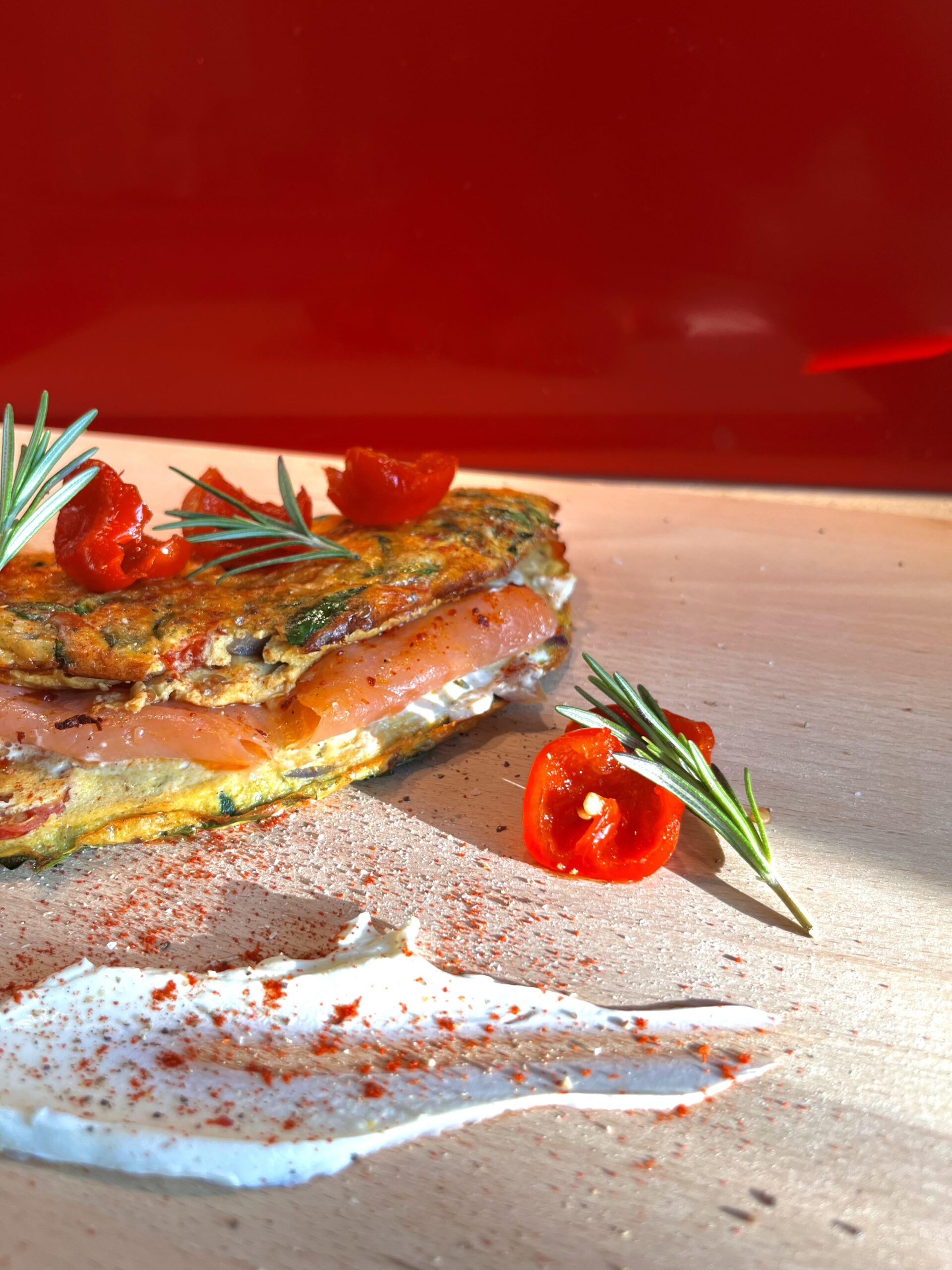 Ingredients * Smoked Salmon * Cream Cheese * 4 large eggs * 50g Red Leicester cheese, grated * A Splash of milk (or alternative) * 1 tsp mixed herbs * 1/2 tsp paprika * 1/2 tsp garlic powder * A handful of fresh spinach * 1/4 Red Onion (chopped) * Handful of tomatoes (chopped) * 2 Garlic Gloves (chopped) * A pinch of garlic salt * 1-2 fresh rosemary sprigs (for garnish) * 2-3 cherry peppers, sliced (for garnish)