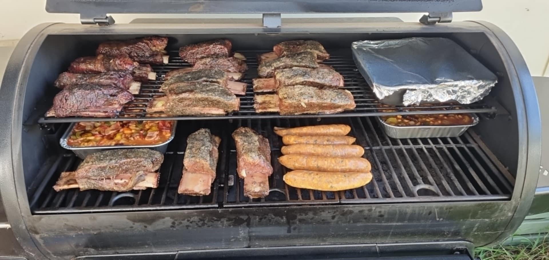 I have a standing offer with my friends: if you bring meat, I will smoke it. One of my friends finally took me up on this offer. I expected her to bring 3-4 beef ribs, but she brought 15! It ended up being an amazing feast. Beef ribs, Australian award winning chicken parmigiana sausages, pork belly burnt ends and bbq beans.