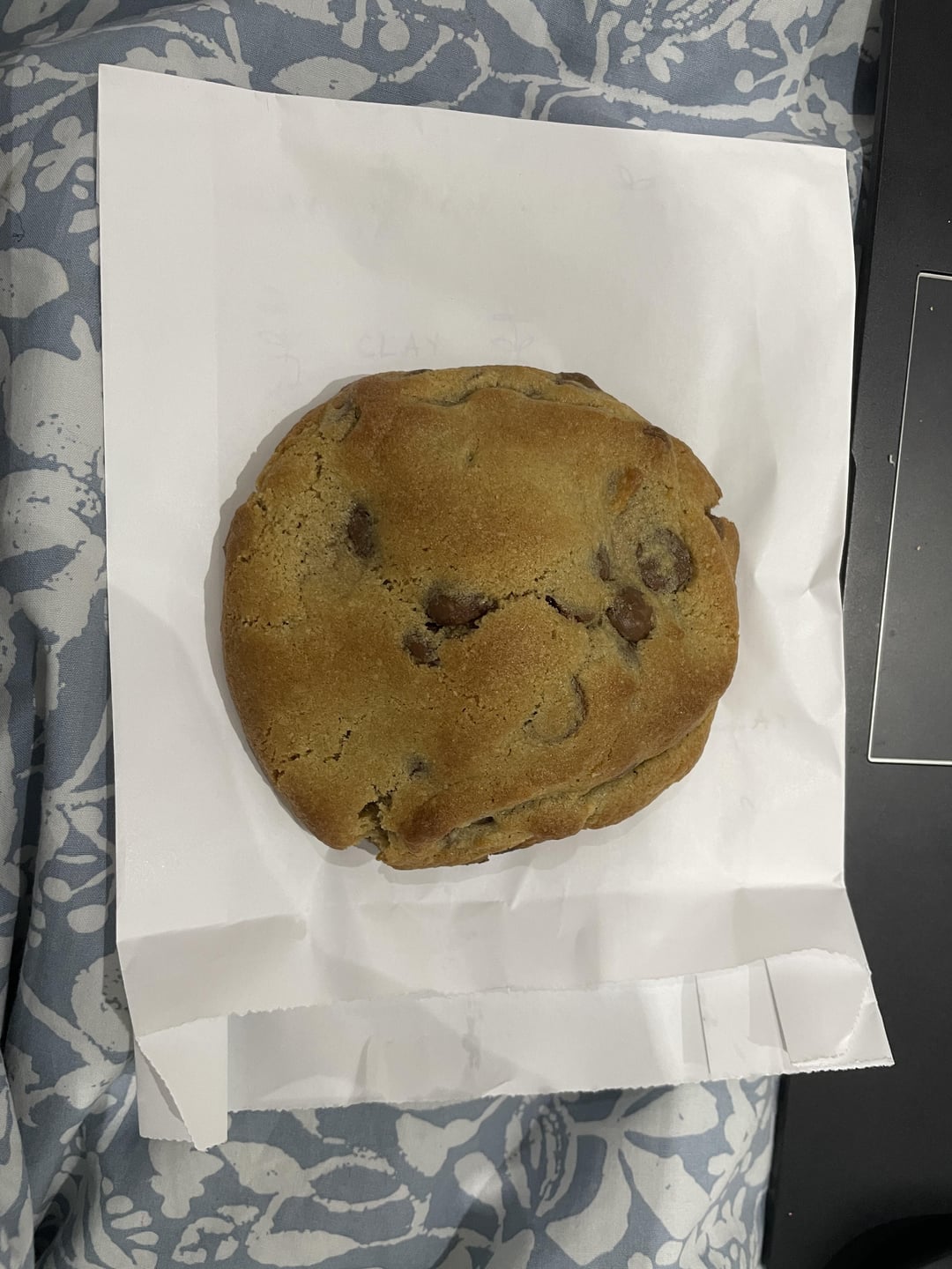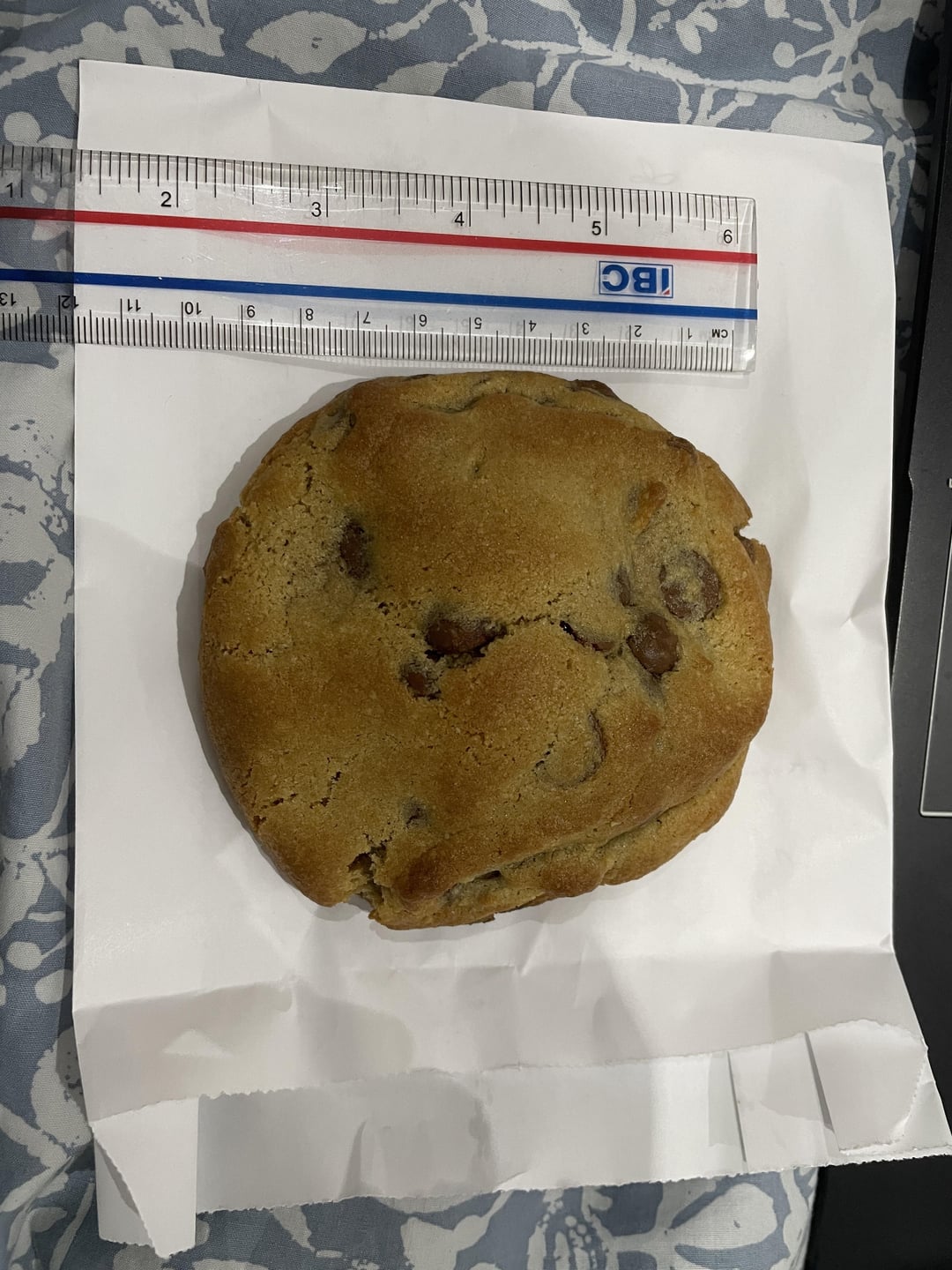 Seeing how the Costco cookie is 750 calories and Crumbl chocolate chip cookie is 680 calories, probably around that amount?