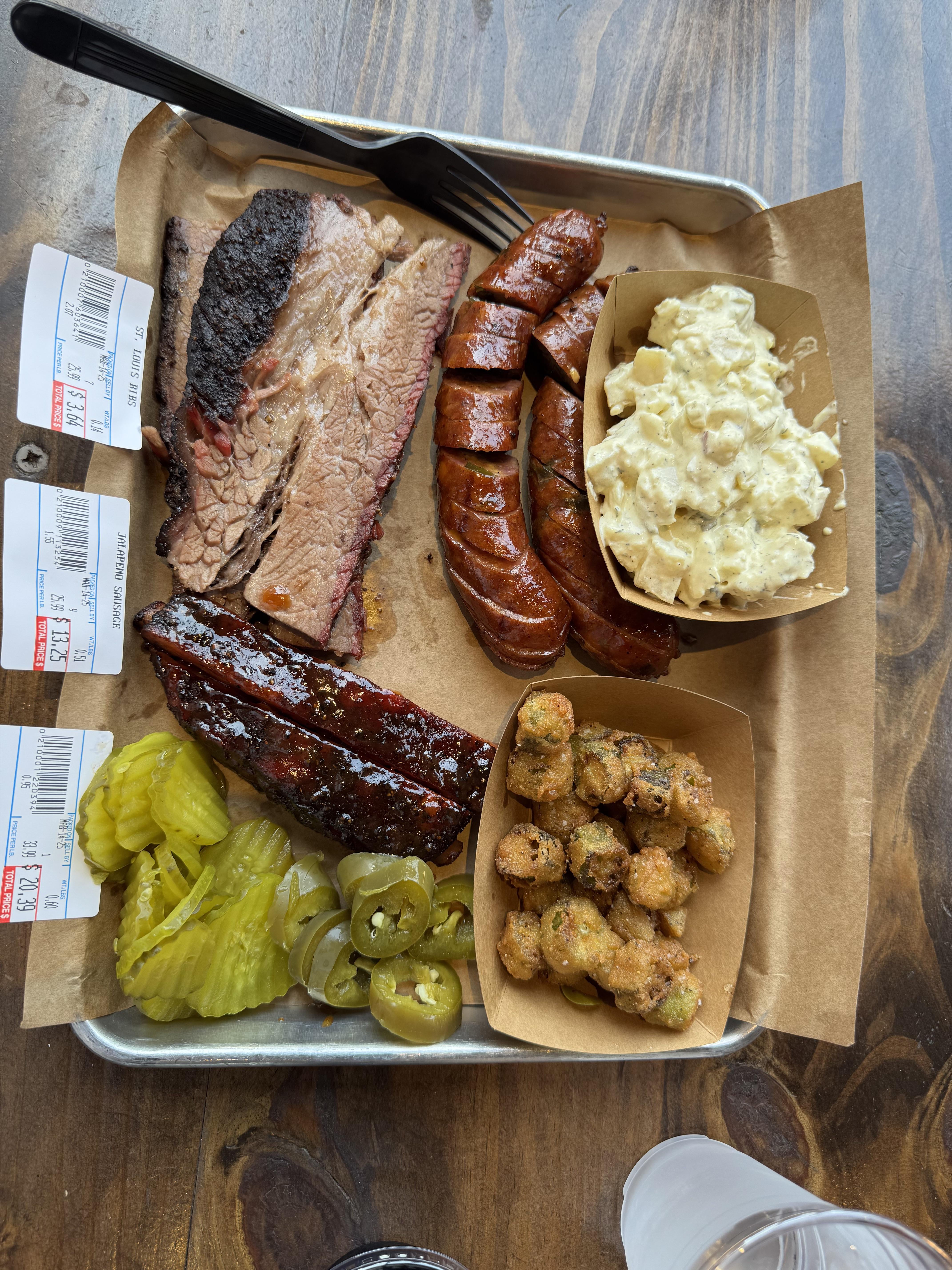 $55 after tip + free dessert bar. Hyped up a lot by my buddy, and overall pretty solid. Not my favorite bbq in DFW, but certainly a good meal. The free desserts really kick things up a notch. The brisket was best with thick pieces of bark and some fat, the leaner parts were a bit dry. Jalapeño sausage was 10/10. Ribs are given a sweet glaze before plating, and next time I’d skip out on it. Too sweet for my taste. Gotta love free pickled veg as well!