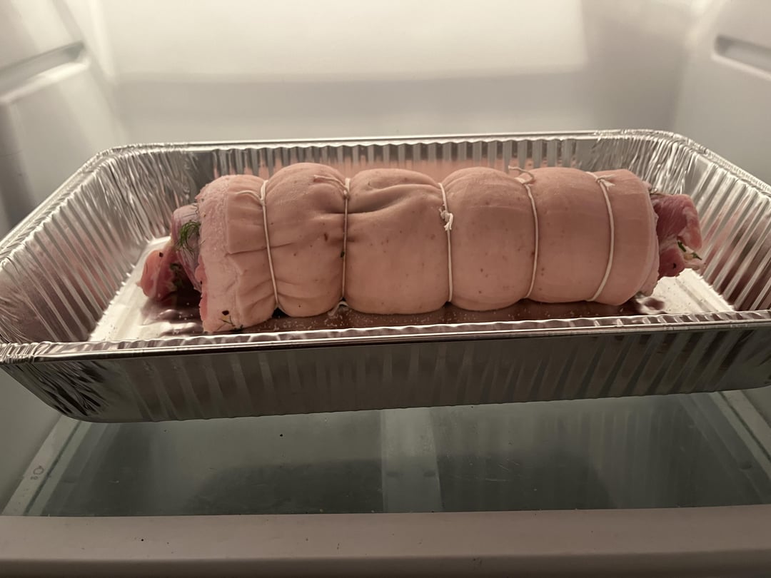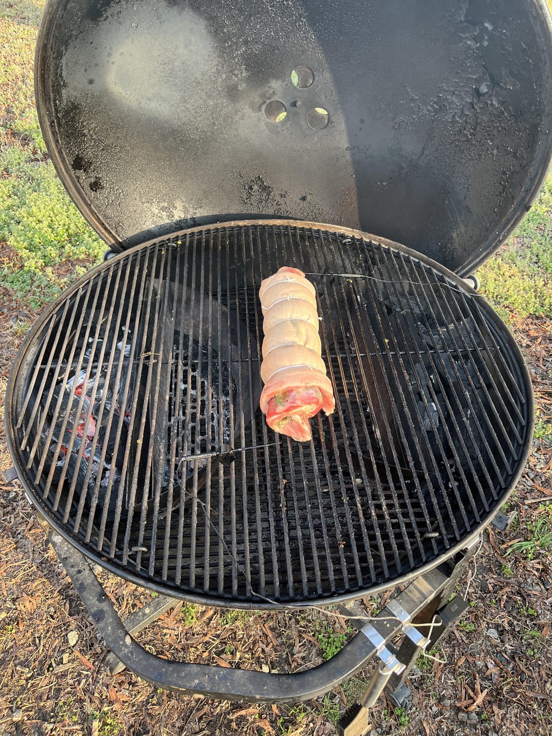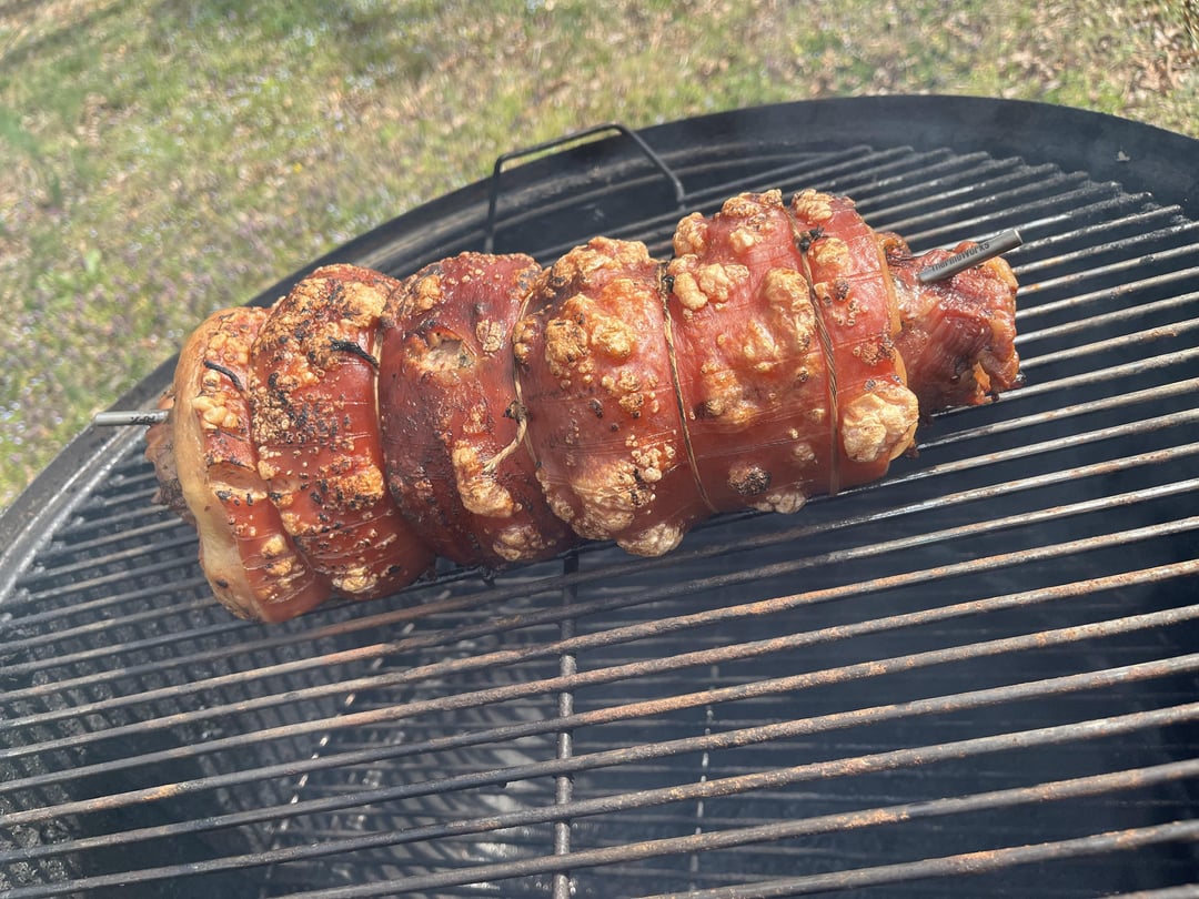 Skin on pork belly lightly scored. Seasoned with fennel fronds, sage leaves, garlic, salt, pepper, and lemon zest. Rolled and tied then left in the refrigerator for about 36 hours before cooking on the ranch kettle.