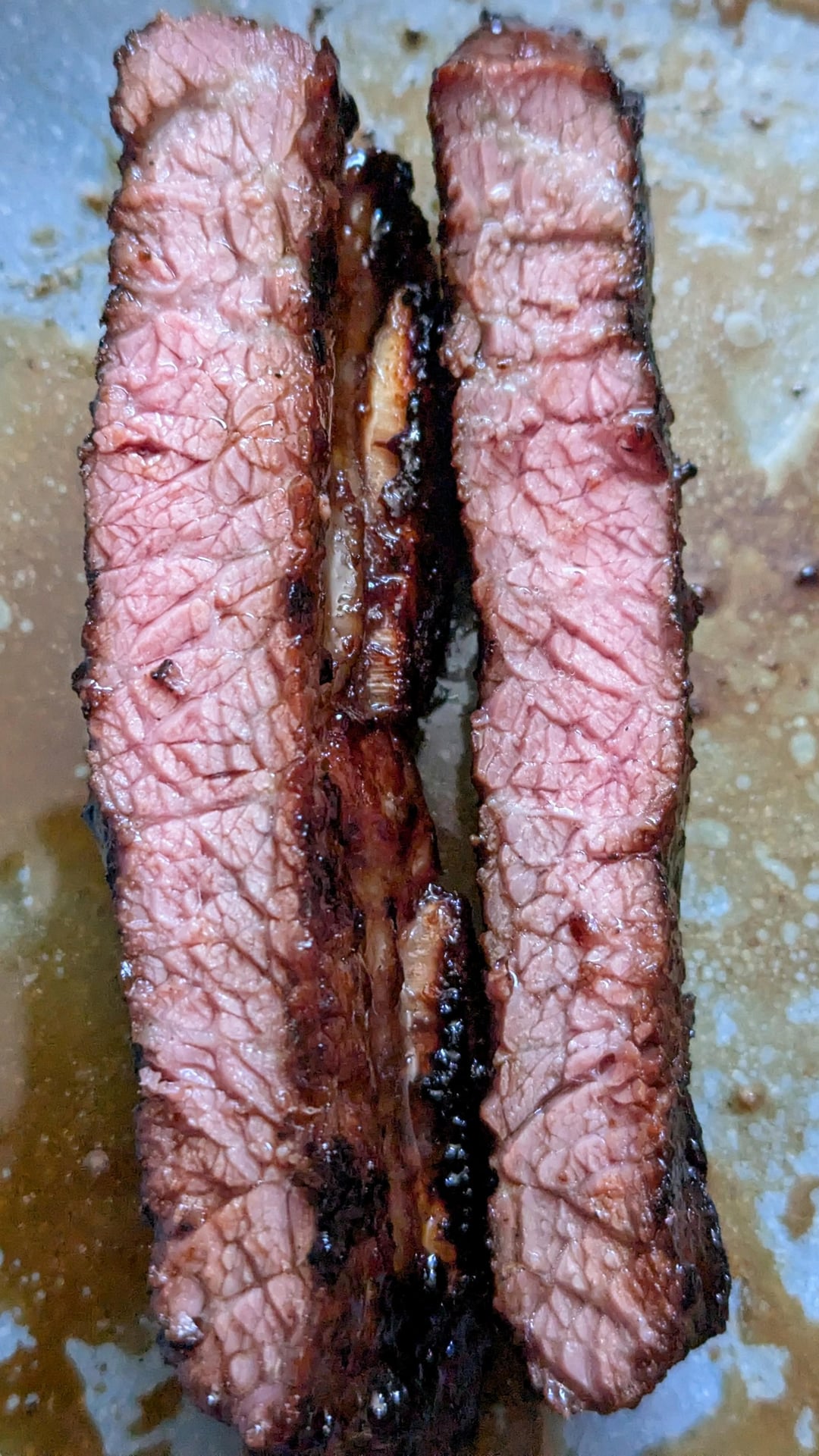 I simply grabbed this 16 Oz portion on sale at the local grocery store and marinated the pieces overnight in an excellent sweet & savory kalbi / galbi sauce (because they’re such a thick cut). Next day they were grilled over direct high heat & served. Highly recommended, easy to do.