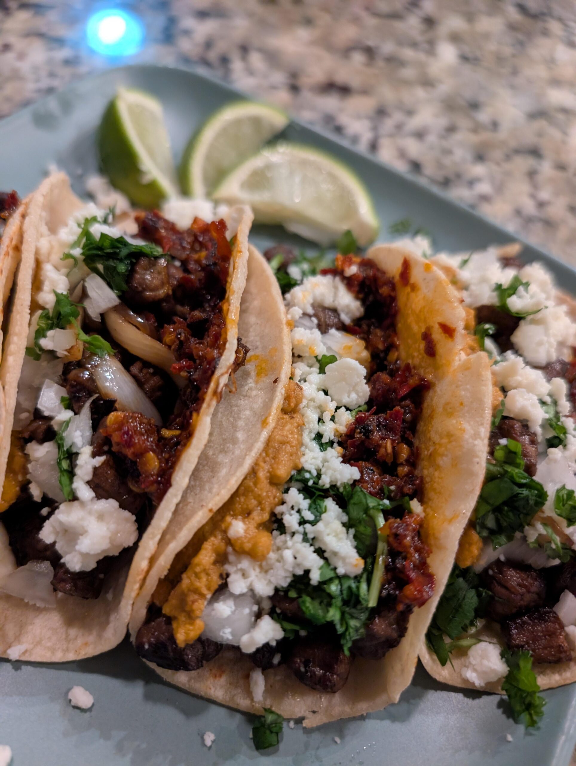 My take on Tacos de Bistec featuring two salsas. Salsa de Jalapeño y Serrano Salsa Macha Queso Ranchero Limón Cilantro Sauteed Onion Diced onion Beef Corn tortillasby Zangkief Write A CommentYou must be logged in to post a comment.