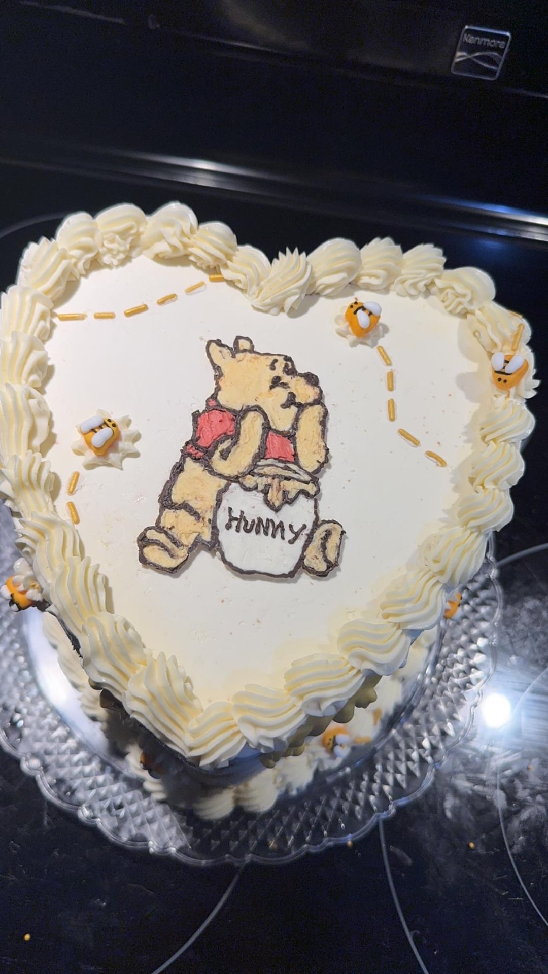 This could not BEE any cuter!! The “honey” drips, the Pooh detail, all the neatly-done piping… you did a beautiful job. I’d buy this cake!