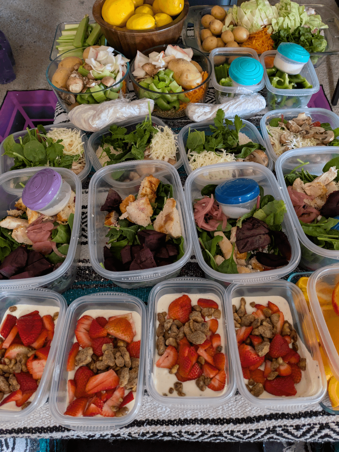 Lunch/dinner: a salad with chicken, beets, tomatoes, spinach, goat cheese, onions I pickled myself, and boathouse ranch; salmon risotto with tomatoes and spinach to be cooked day of (can't stand reheated fish); pre chopped making of "gardeners pie" which is Sheppard's pie with lentils instead of meat; pre chopped veggies for corn beef (brisket not shown) to be slow cooked on Monday for st Pat's.