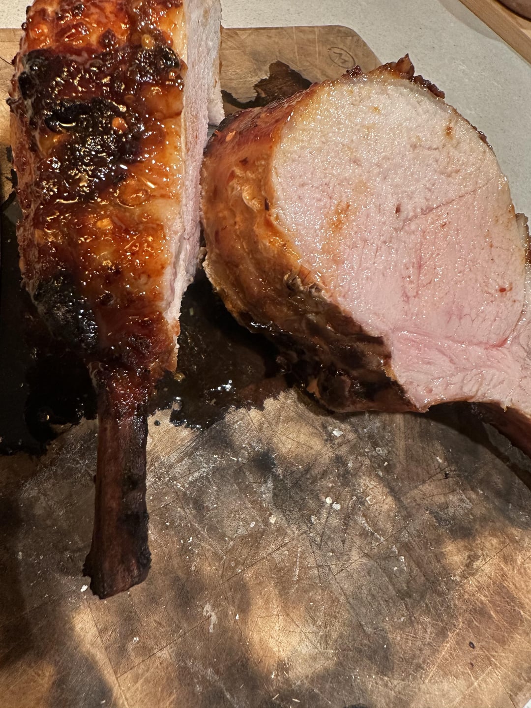 That looks delicious. For me at least, I prefer when pork chops are cut into steaks first before grilling/searing. More surface area for char and milliard reaction means more flavor.