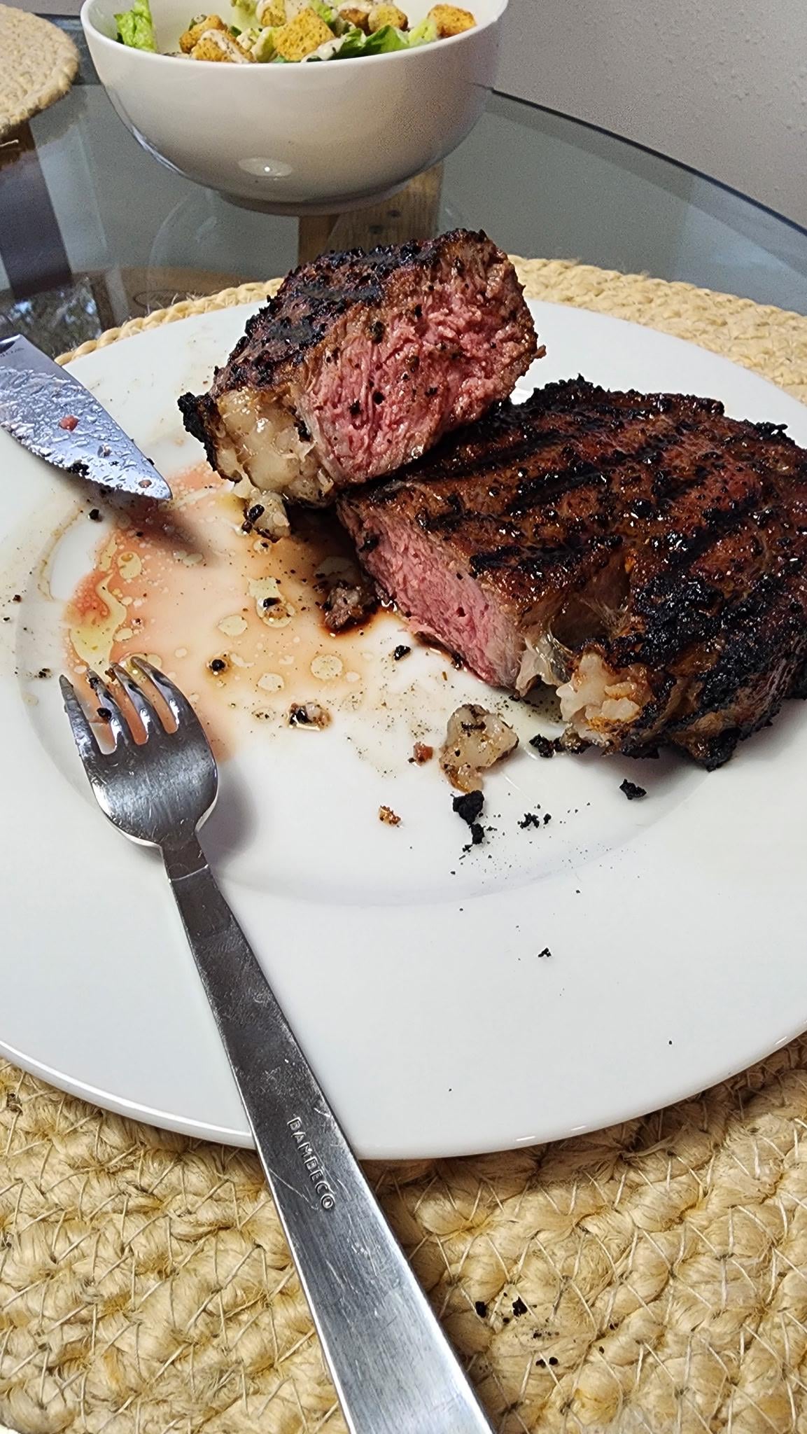 Simple recipe…Killer Hogs AP and Steak Seasoning. Grill temp at 295F until an internal of 125F. Rested while the Joe went full airflow (about 10 minutes). Went back on the grill, which was at 900F, for 45 seconds per side.