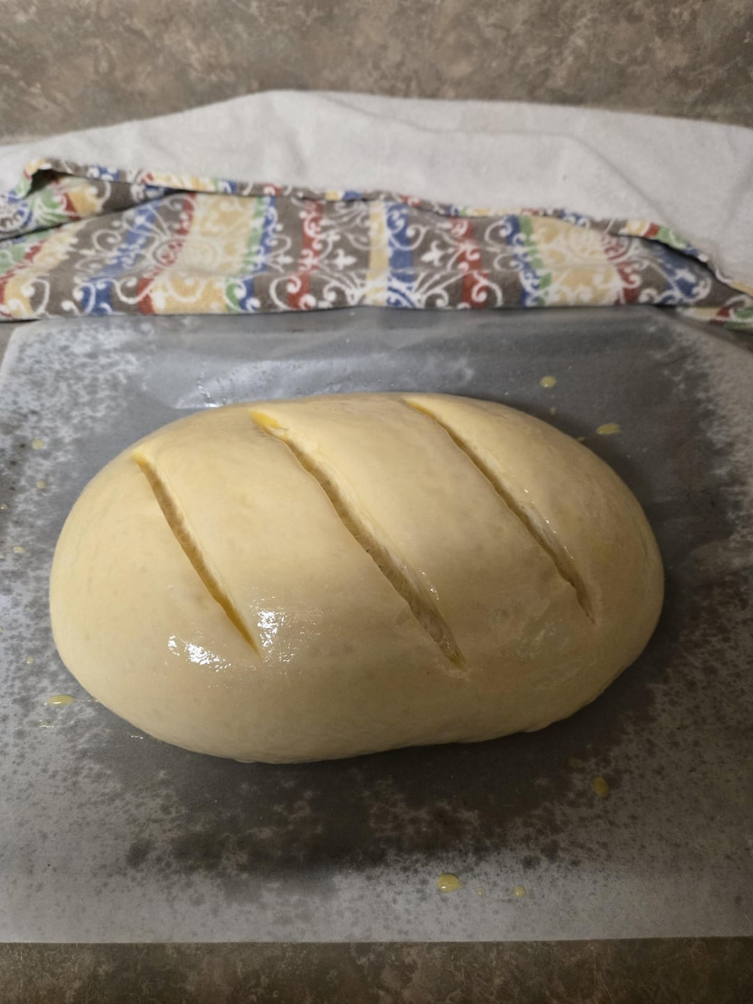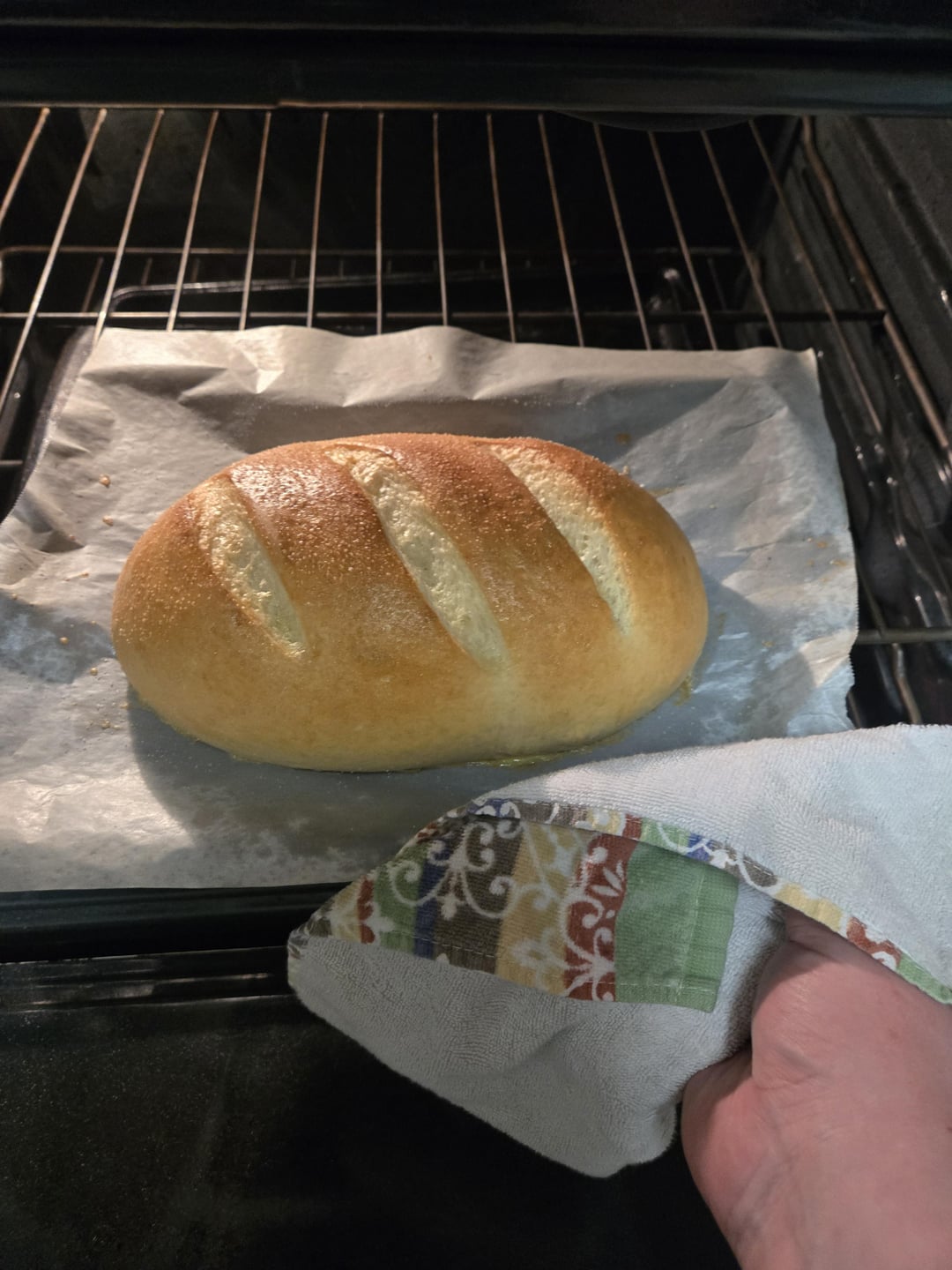 As the title says.. first time making bread. First time posting in this sub. Learning as we go! Just took it out of the oven, so havent cut into it yet. Ill try to make an update post tomorrow when its fully cooled. Any advice would be awesome!
