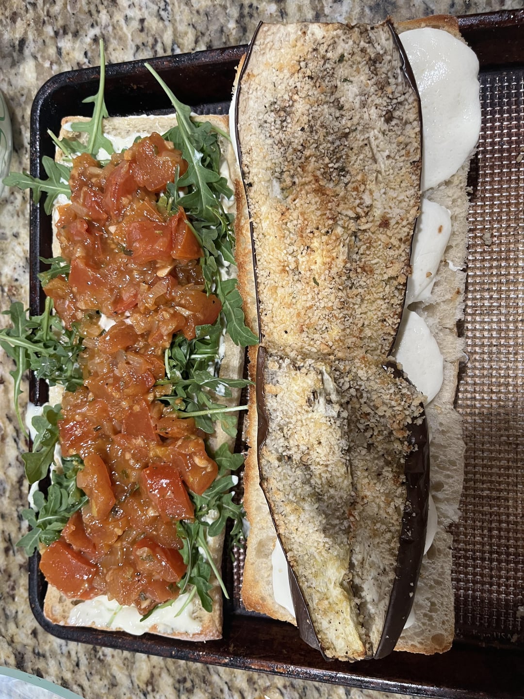 Breaded and baked eggplant w mozzarella on a toasted ciabatta. Topped with tomato relish, arugula and a lemon tarragon mayo.by Efficient_Art_1144 Write A CommentYou must be logged in to post a comment.