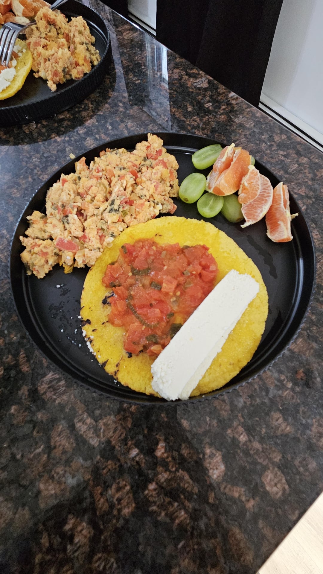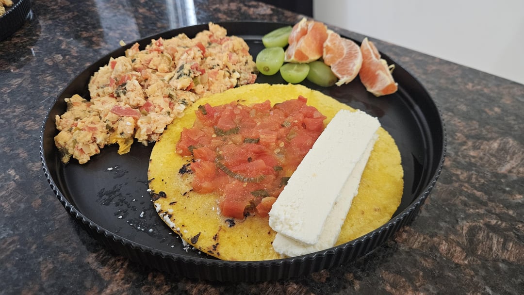 Scrambled eggs with hogao (tomatoes, onion, scallions), arepa, cheese, hogan, and fruits