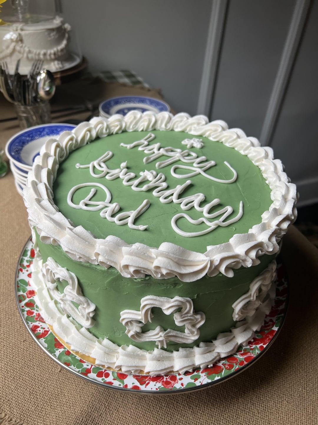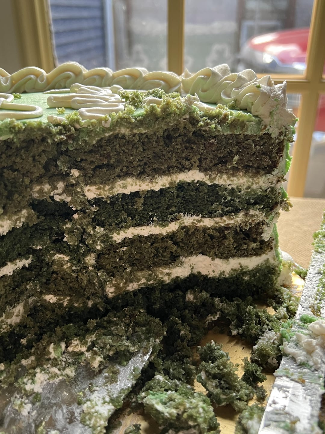 Green velvet cake with cream cheese frosting (my dad’s birthday is St. Patrick’s day!)