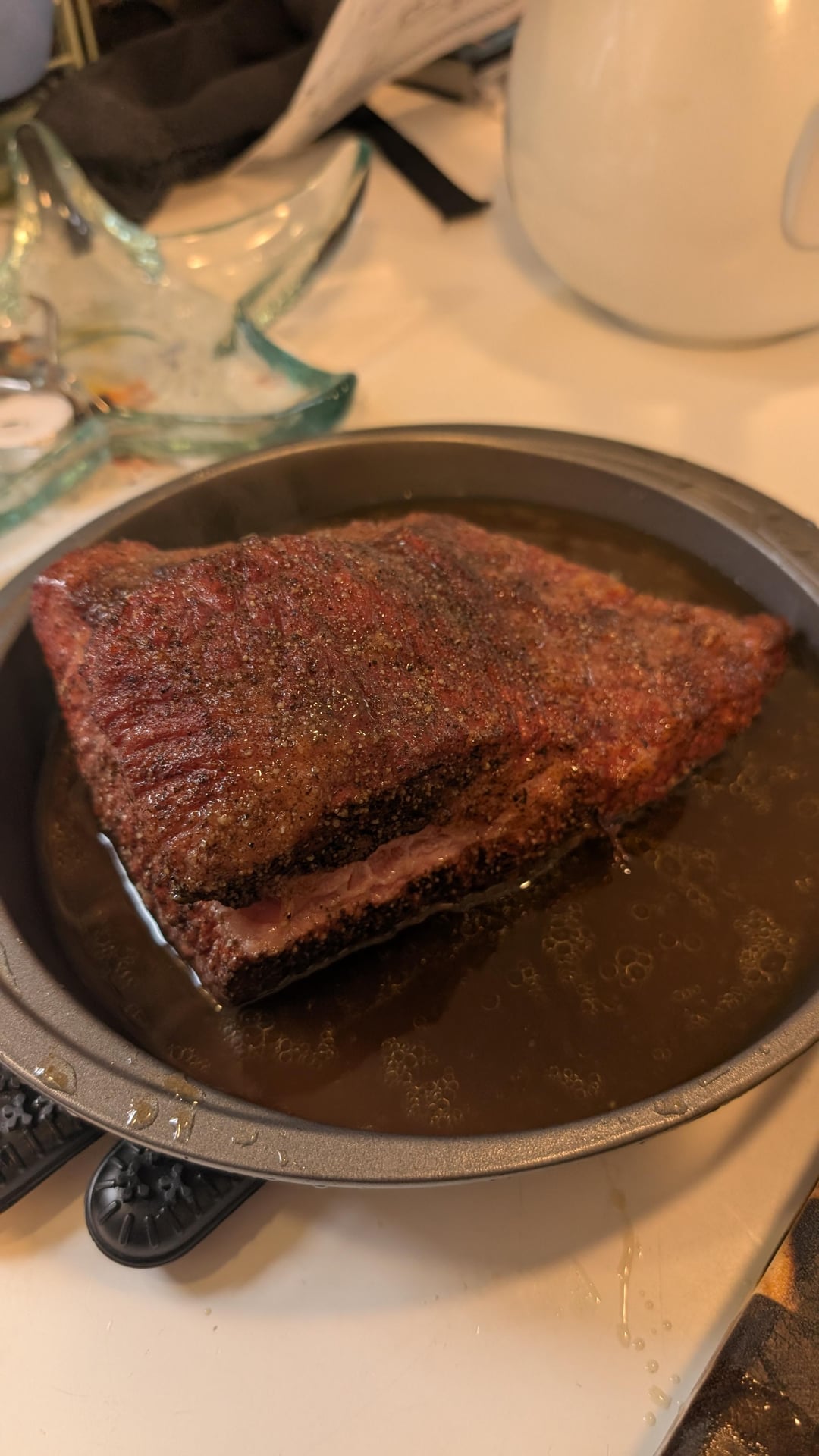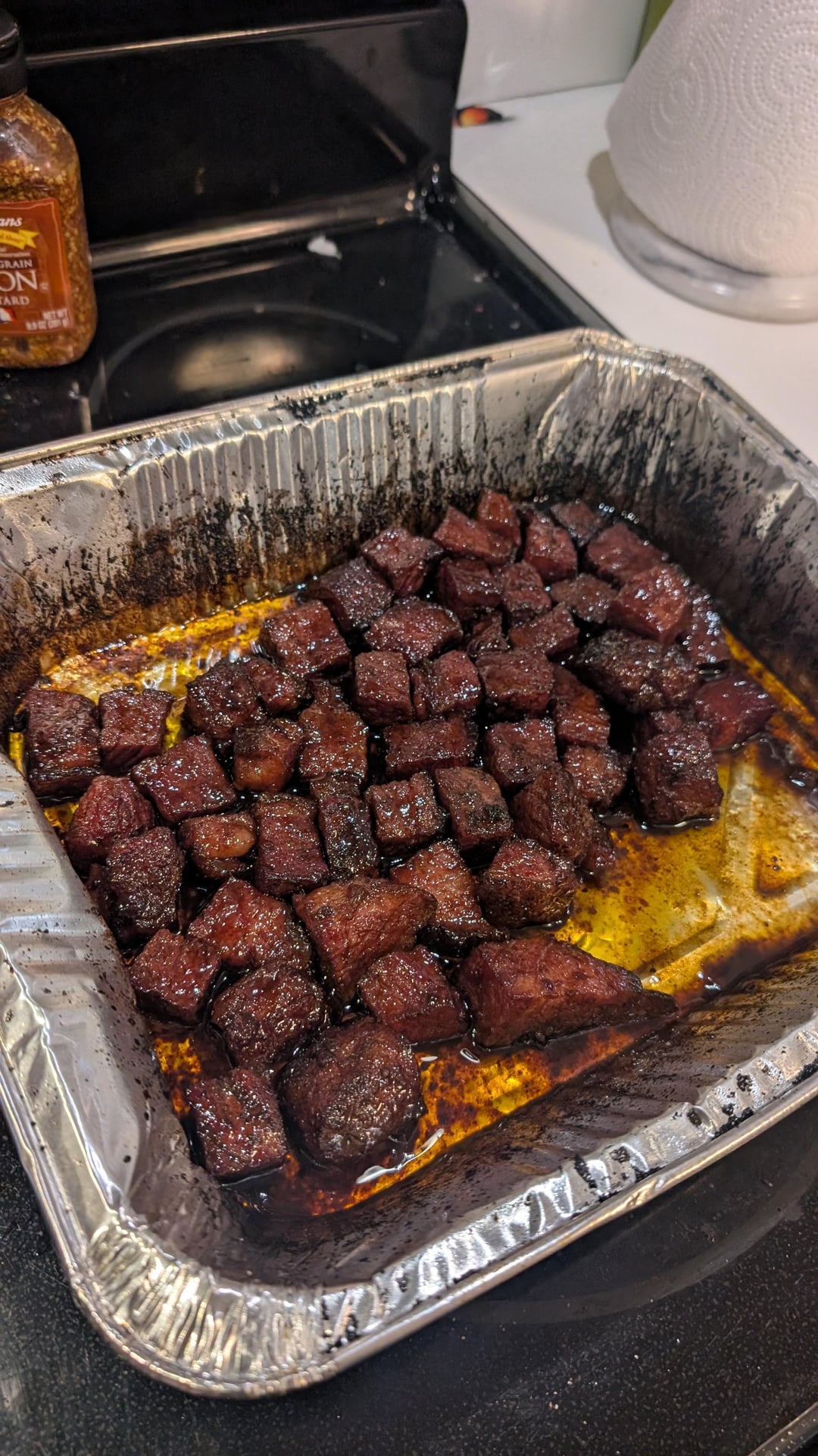 Holy shit its like crack cocaine. Basically 250 till it hit 165° then put in some Guinness and butter in a pan. Cover and back on till its hits 195°. Then pulled and cubed and put a glaze of beer and sugar and bbq.