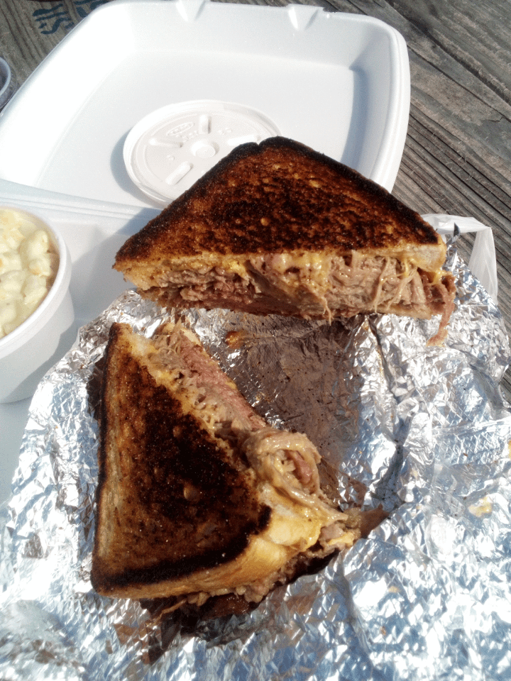 Stopped at a small roadside BBQ and bakery spot the other day. Pulled pork grilled cheese with Mac and cheese and baked beans was only $11.50.