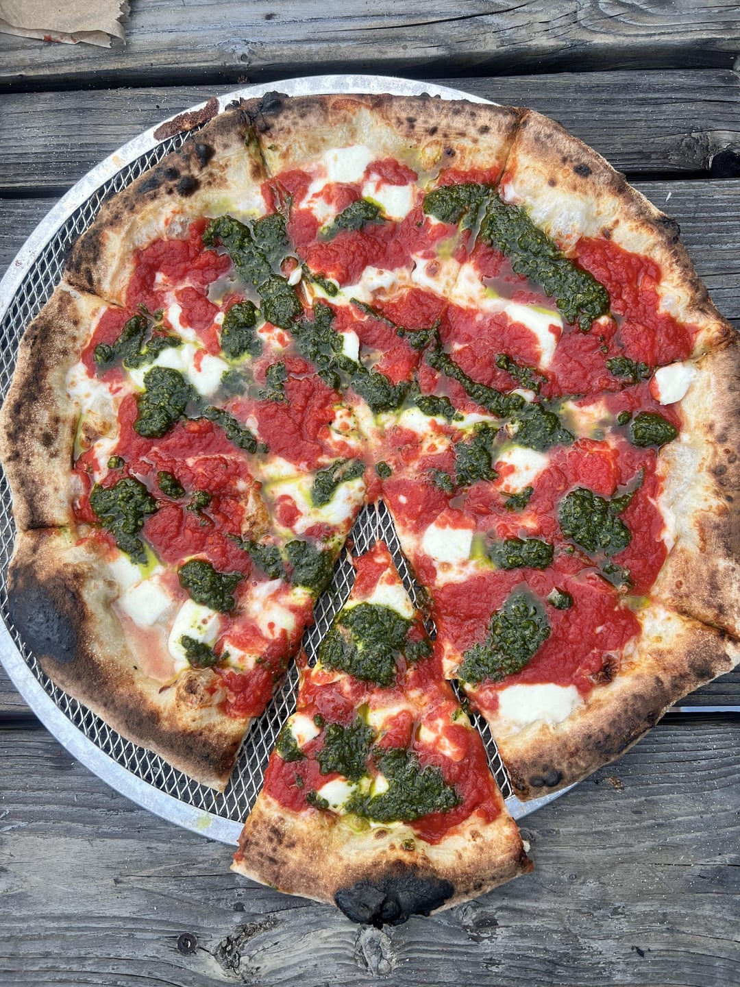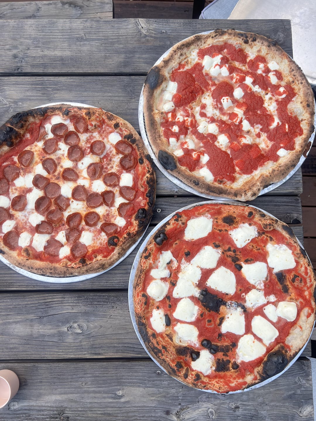 Pies are a pepperoni with basil, a sauce on top with pesto, and a classic margarita