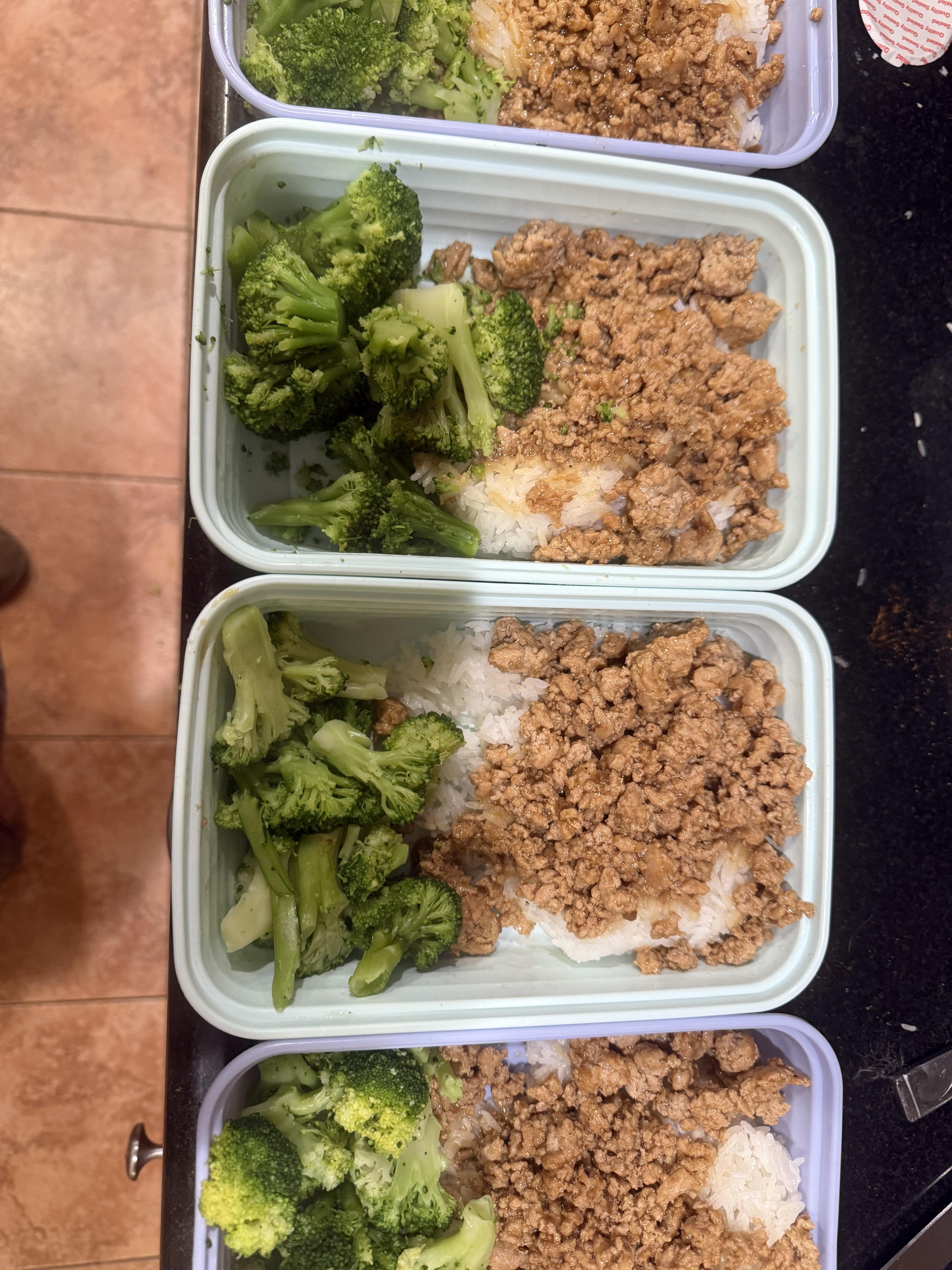 When I say it’s quick and easy it’s not a joke. I brown 2 lbs of ground chicken, drain. Add a bottle of GF Hugh’s teriyaki sauce (which is gf sf), rice, and broccoli. I just can not bring myself to eat the same meal all week, so a quick and easy allows me to make 2-3 meals instead. I’ll add seasonings as I want, including ginger.