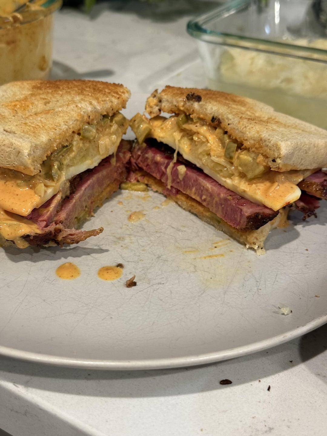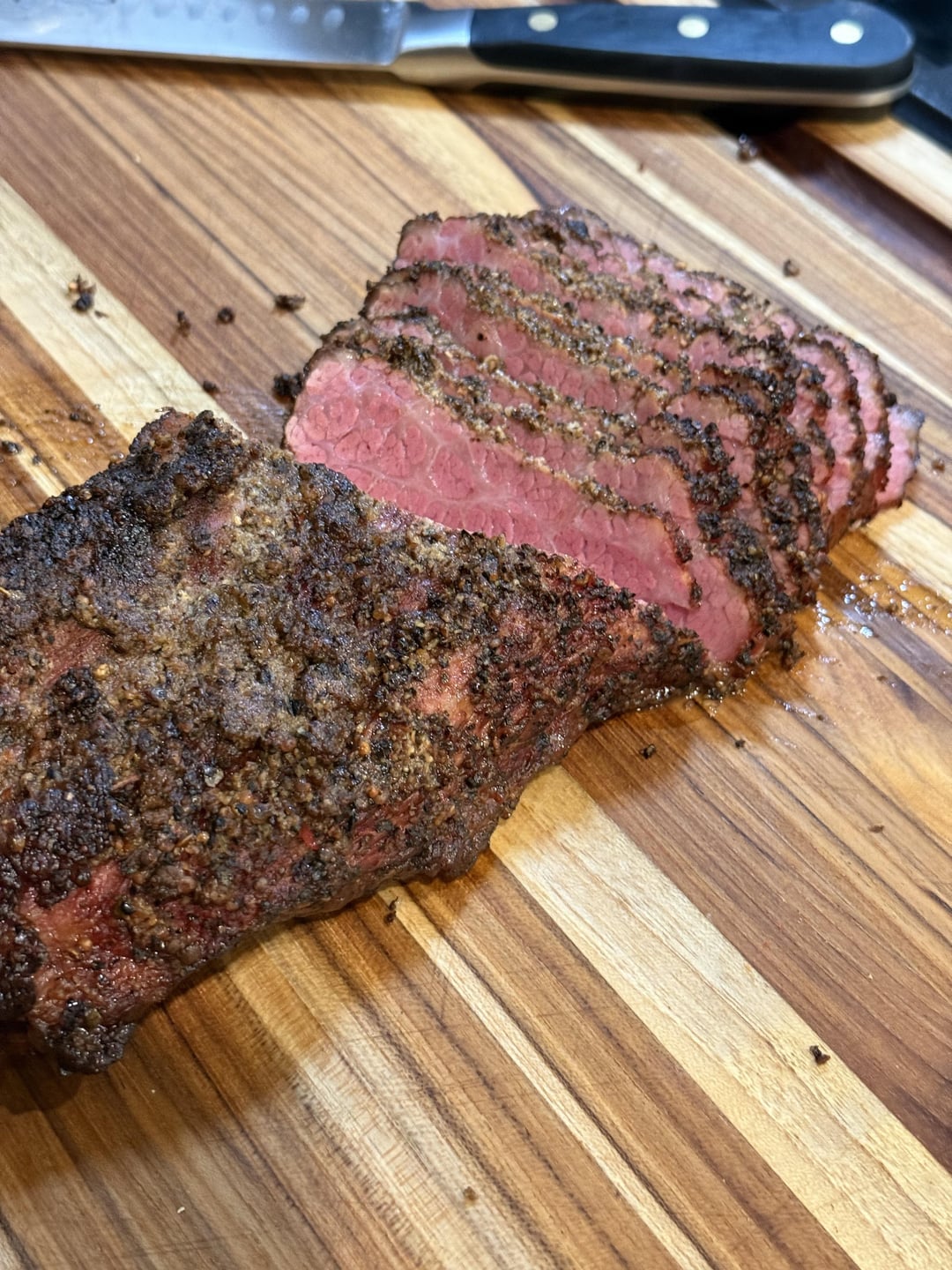How many pastrami/corned beef post will we see? Here is one to add to the lot! Slathered with Guinness and Mustard, rubbed with a homemade rub, cooked at 250 with smoke tube, spritzed with Guinness. Came out Delish.