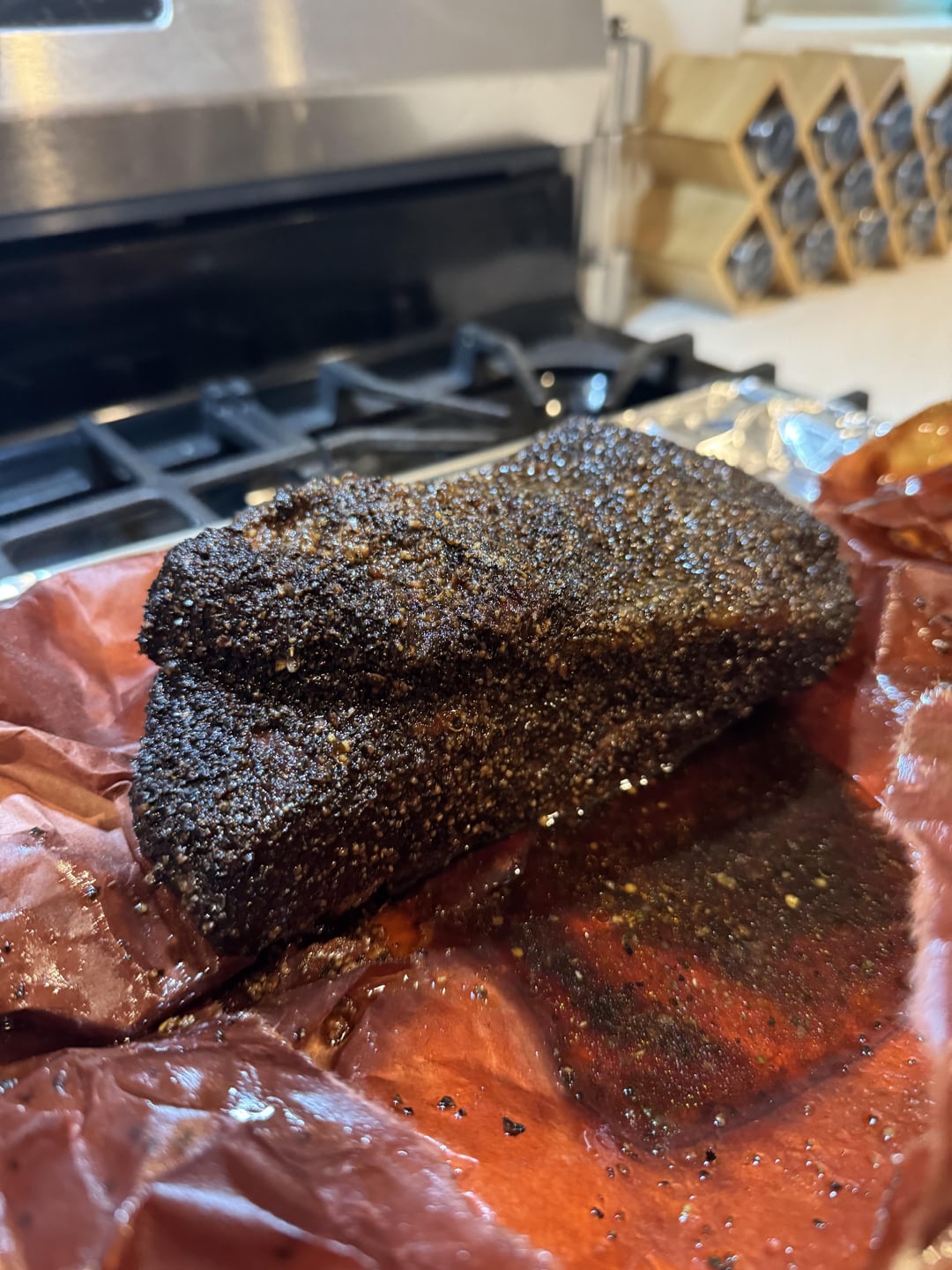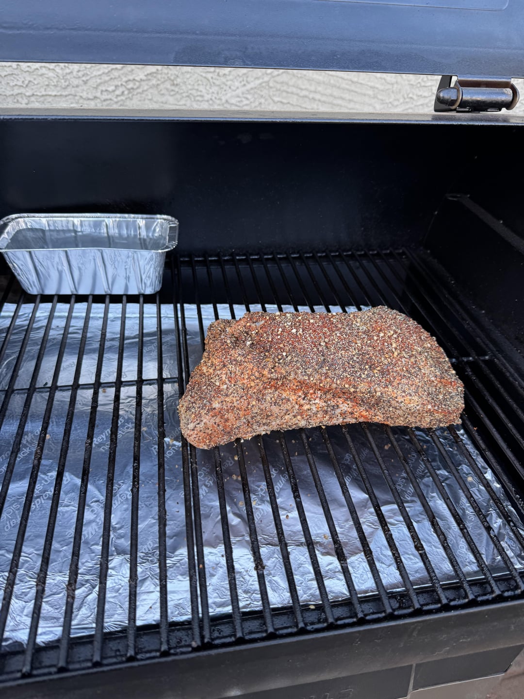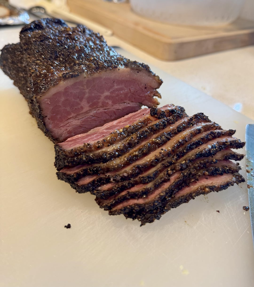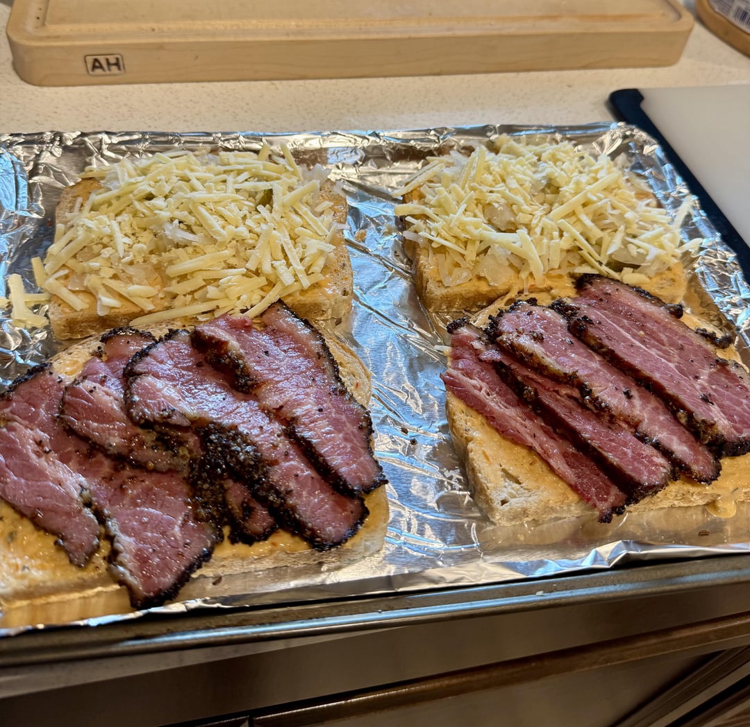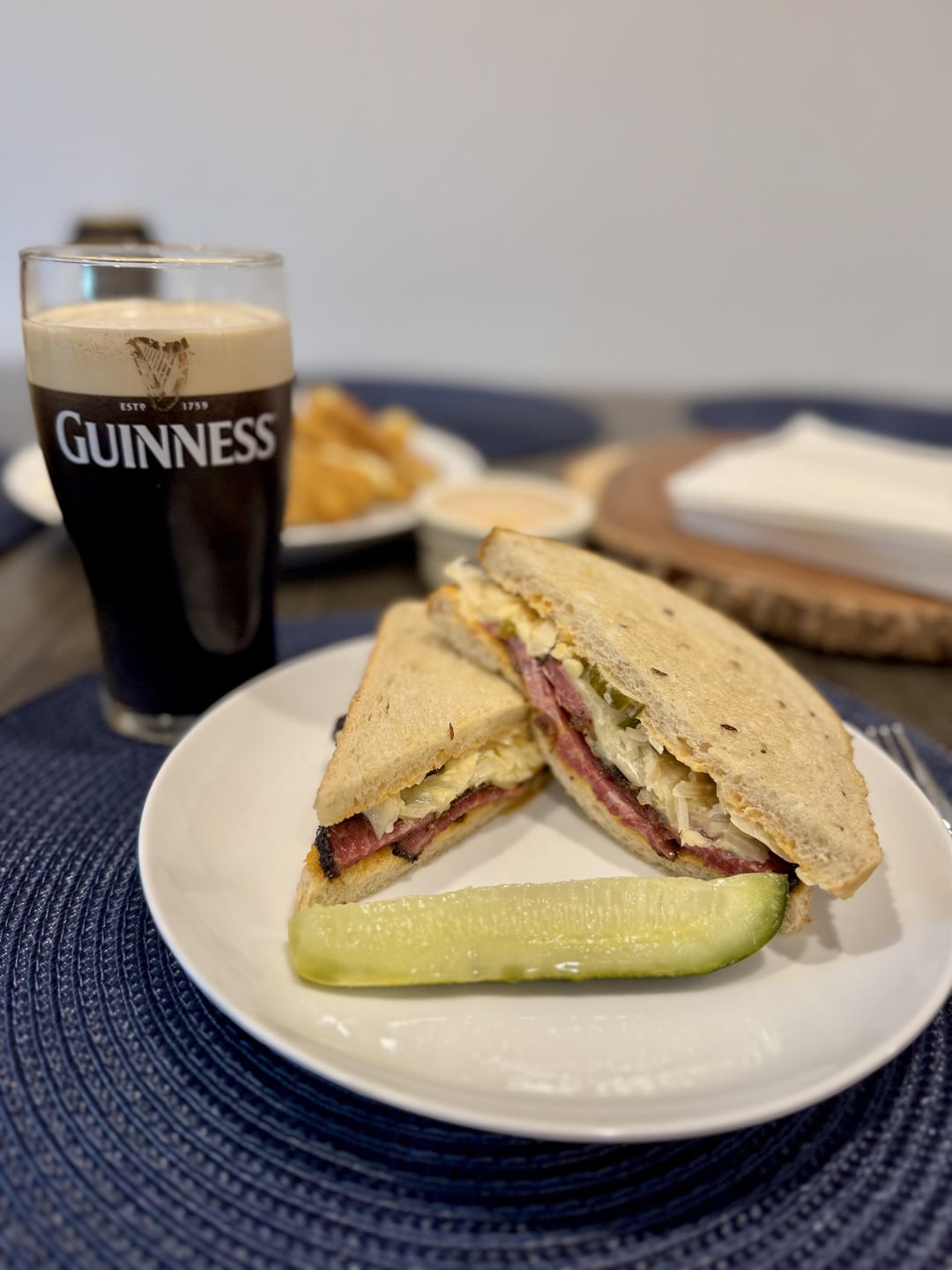3lb Cured Brisket, smoked at 225F 1 hours, 250F 2 hours, 275F 3 hours. Rested at ovens lowest temp (170 for me) for 3 hours. Sliced and served on Rye bread, Russian dressing, sauerkraut, Swiss cheese, and side Claussen pickle. Poured up the Guinness, cheers