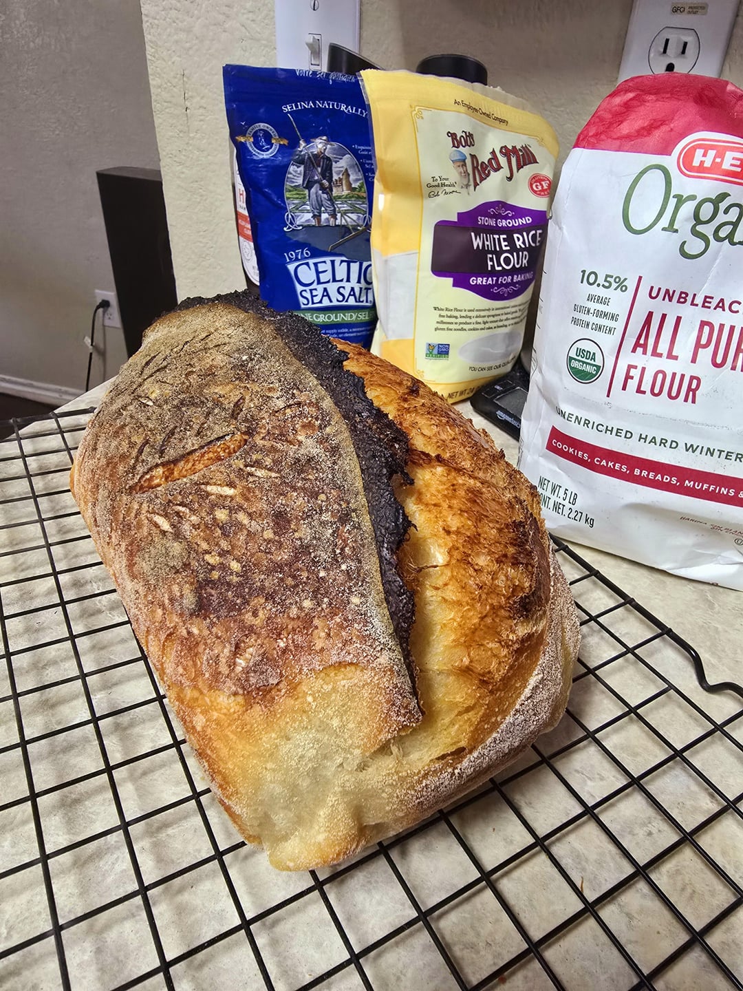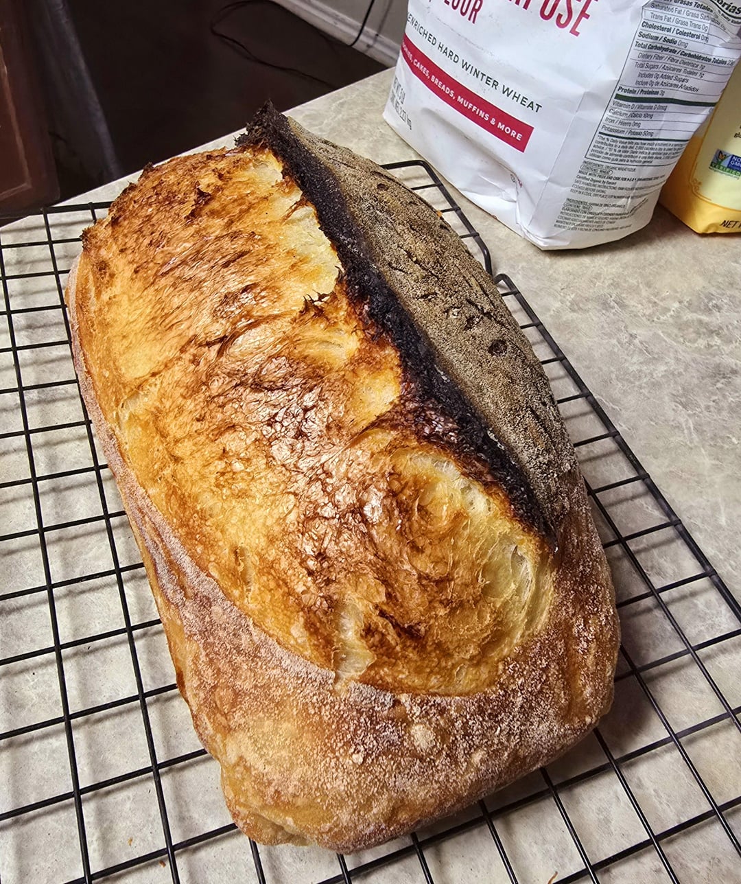 1 hour sit, 4 stretch n folds every 30 minutes, counter proof almost 5 hours (it was 80F in our house that day and the dough temp matched so it went quick) in the fridge for 16 hours. Preheated oven to 500 with water tray, put in loaf, lowered oven to 475 for 30 minutes, took top off and lowered oven to 450 for another 15 before the internal temp reached 209. These temps usually keep my loaves with a nice golden brown but sometimes my oven suddenly goes super hot and if you don't notice in time and turn it off and back on it burns everything. 😒
