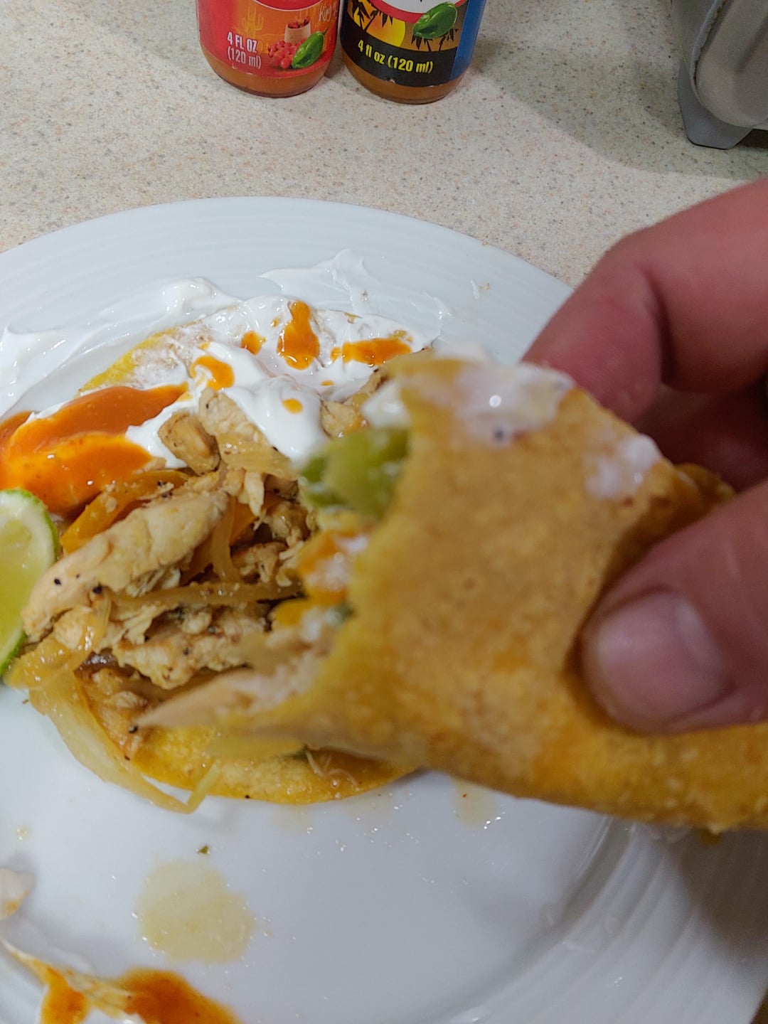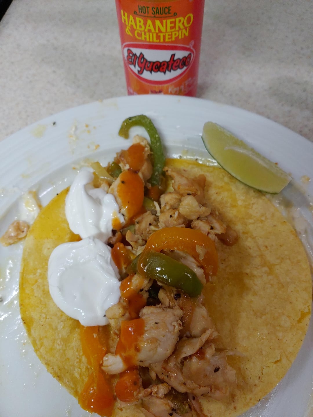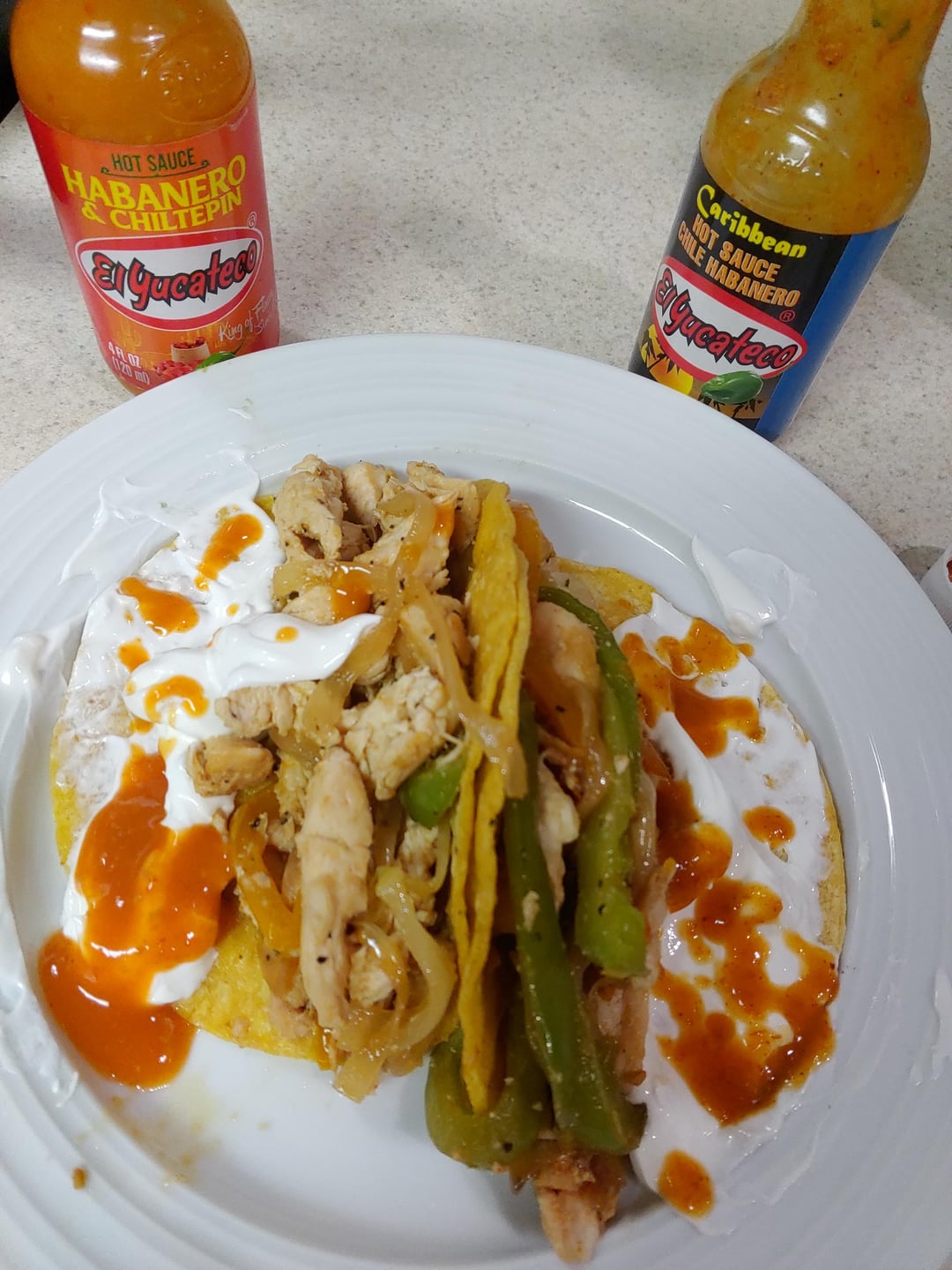 Chicken, onions, bell peppers, corn tortillas, sour cream, hot sauce by pcurepair Write A CommentYou must be logged in to post a comment.