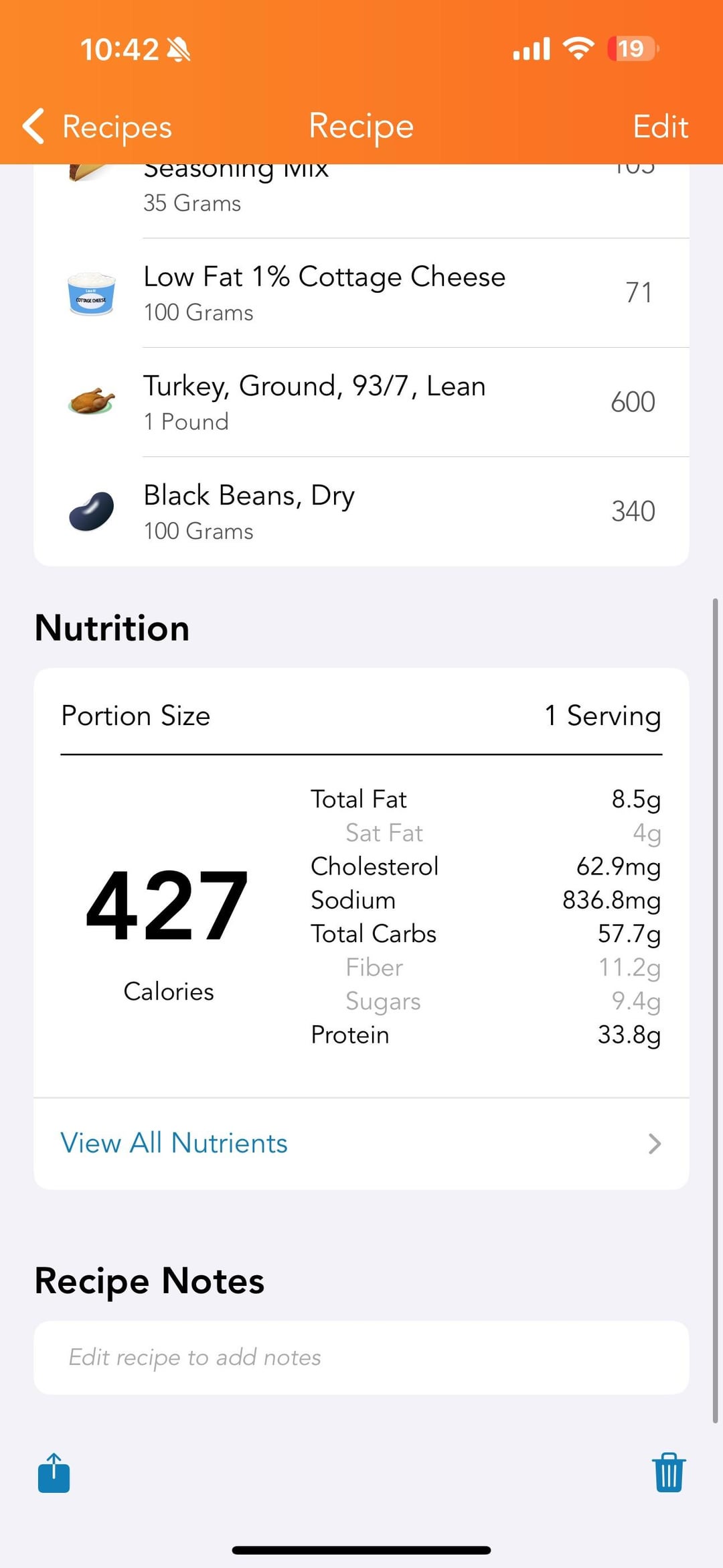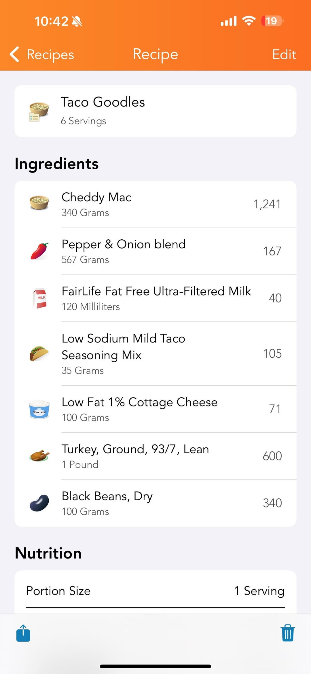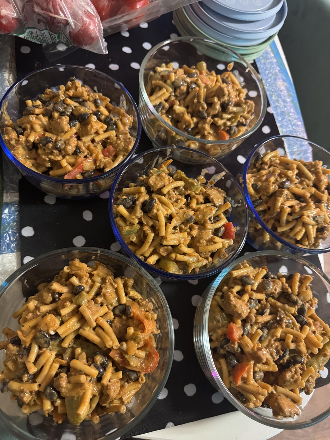In general: two boxes of cheddy mac goodles, some black beans, bag of frozen peppers and onions, pound of 93/7 ground turkey. Sauce is the mac and cheese packets, half cup of milk, big portion of cottage cheese (maybe a cup?), blended til smooth. Comes out to six servings that weigh about 300g each with 427 calories, 11g fiber, 33g protein.