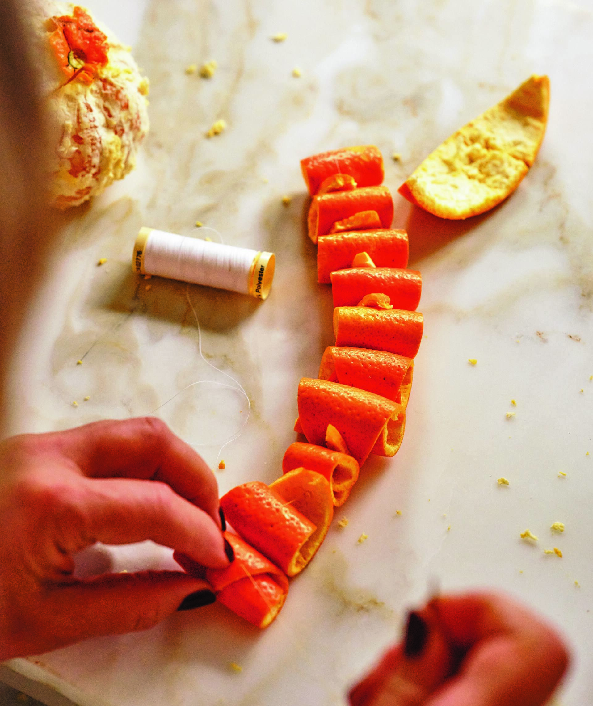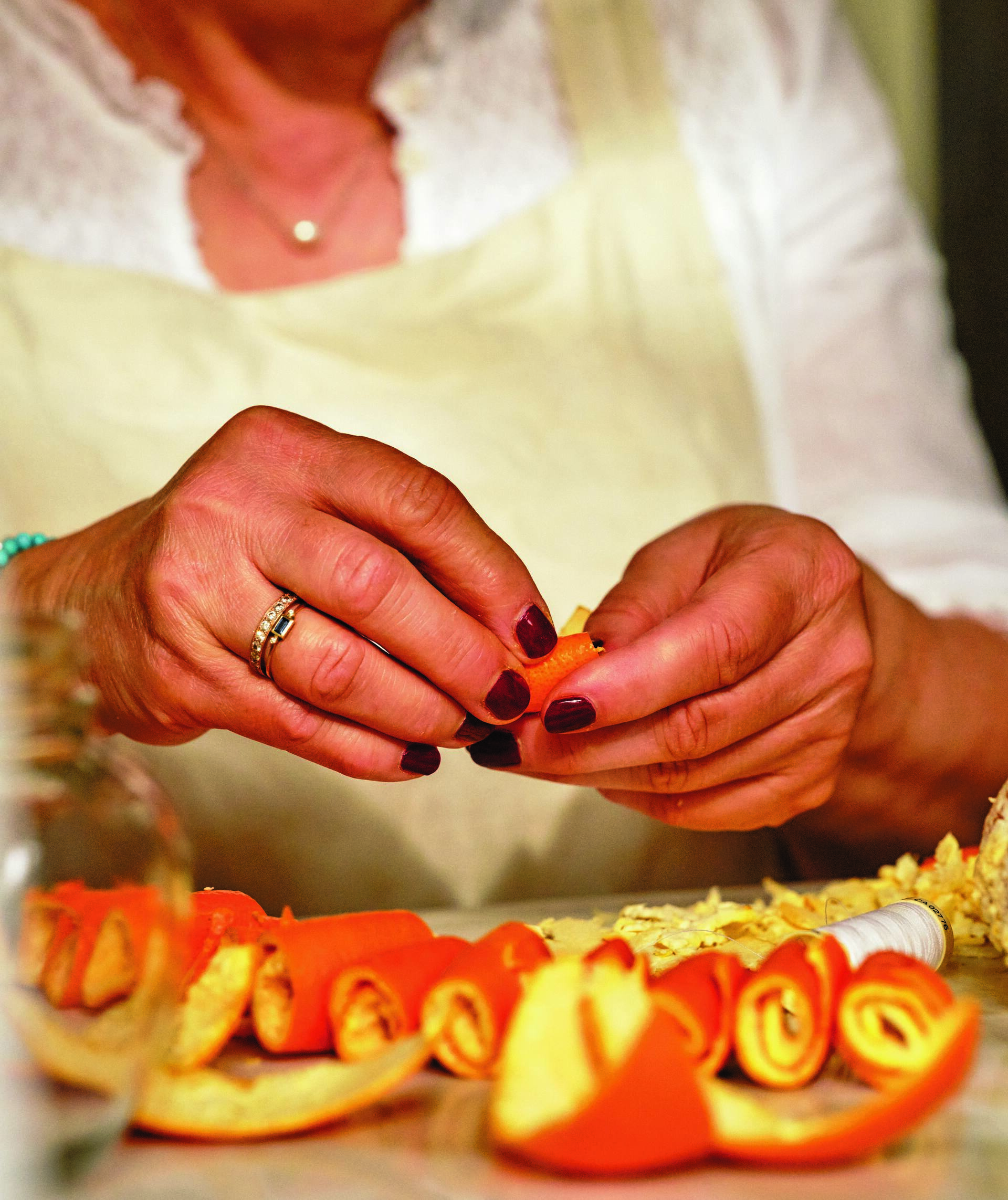 Traditional recipe: Making a necklace of bergamot peel rolls for the spoon sweet. Photo: Stephanie Stamatis/Supplied
