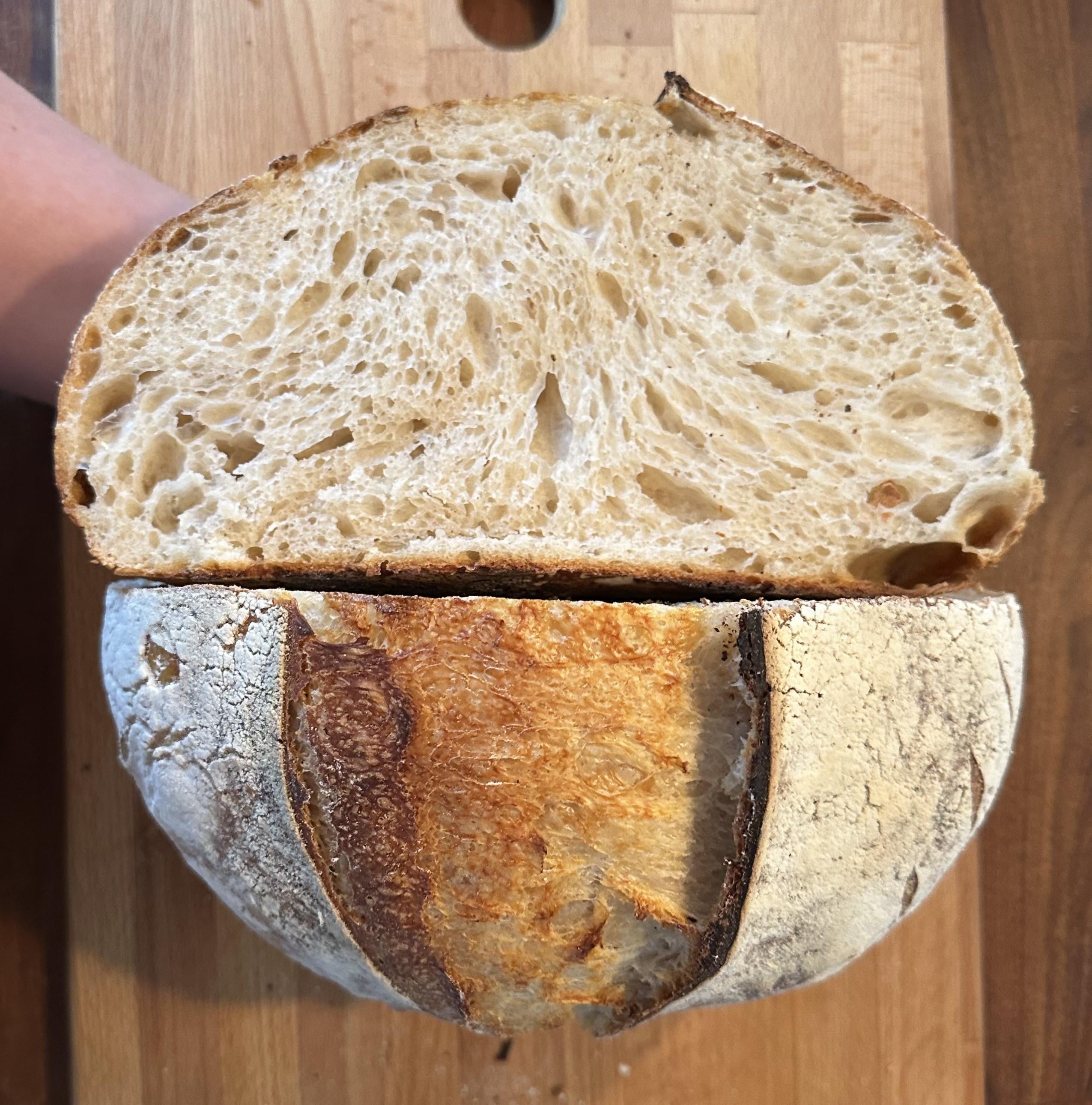 Definitely a million times better than my first attempt (ended up making a large batch of croutons from it). Having the right tools was also a huge help. I also definitely over-floured the tea towel during the cold proof!