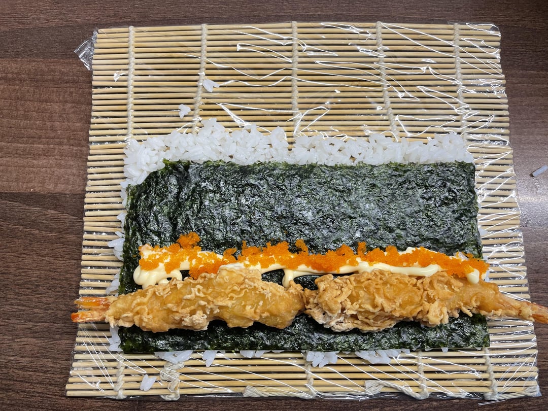 For the inside outs roll I also use half sheets but put more rice on top to get a full round inside out after rolling. Tempura shrimp with QP mayo and a bit of masago roe on the inside and outside all around.