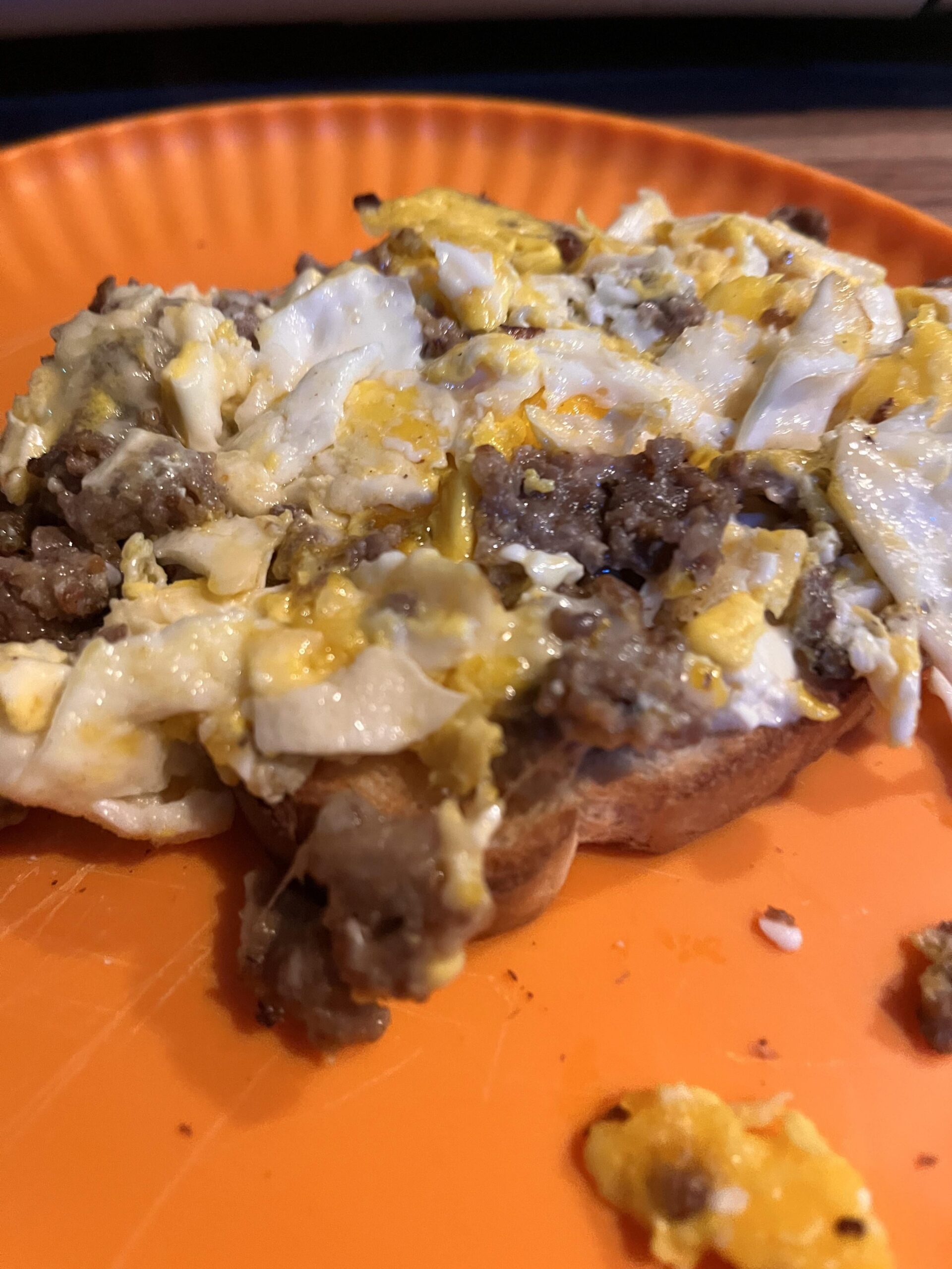 Toast, sweet Italian sausage, eggs, havarti. She’s on dialysis so I didn’t season it.