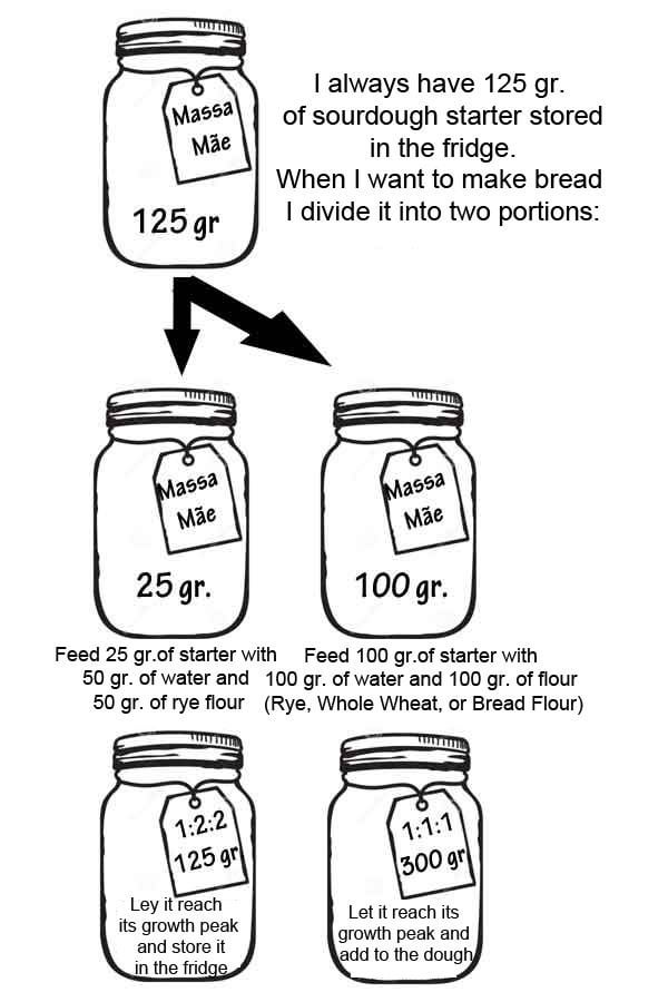 I always have 125 gr. of sourdough starter stored in the refrigerator. When I want to make bread I separate it into two portions: