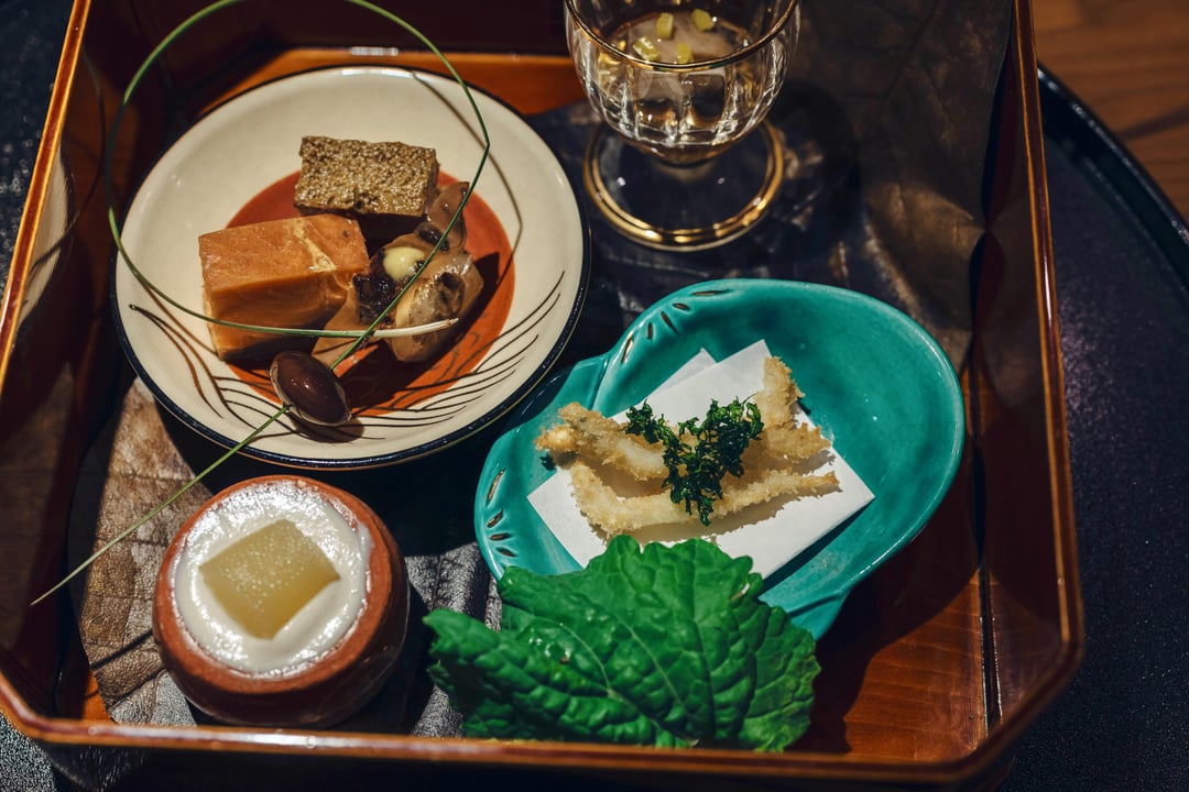 2. Hassun: salmon, white fish arare-yaki, sumi ika, tamagoyaki, Matsukaze chicken, sesame-dressed urui , flounder