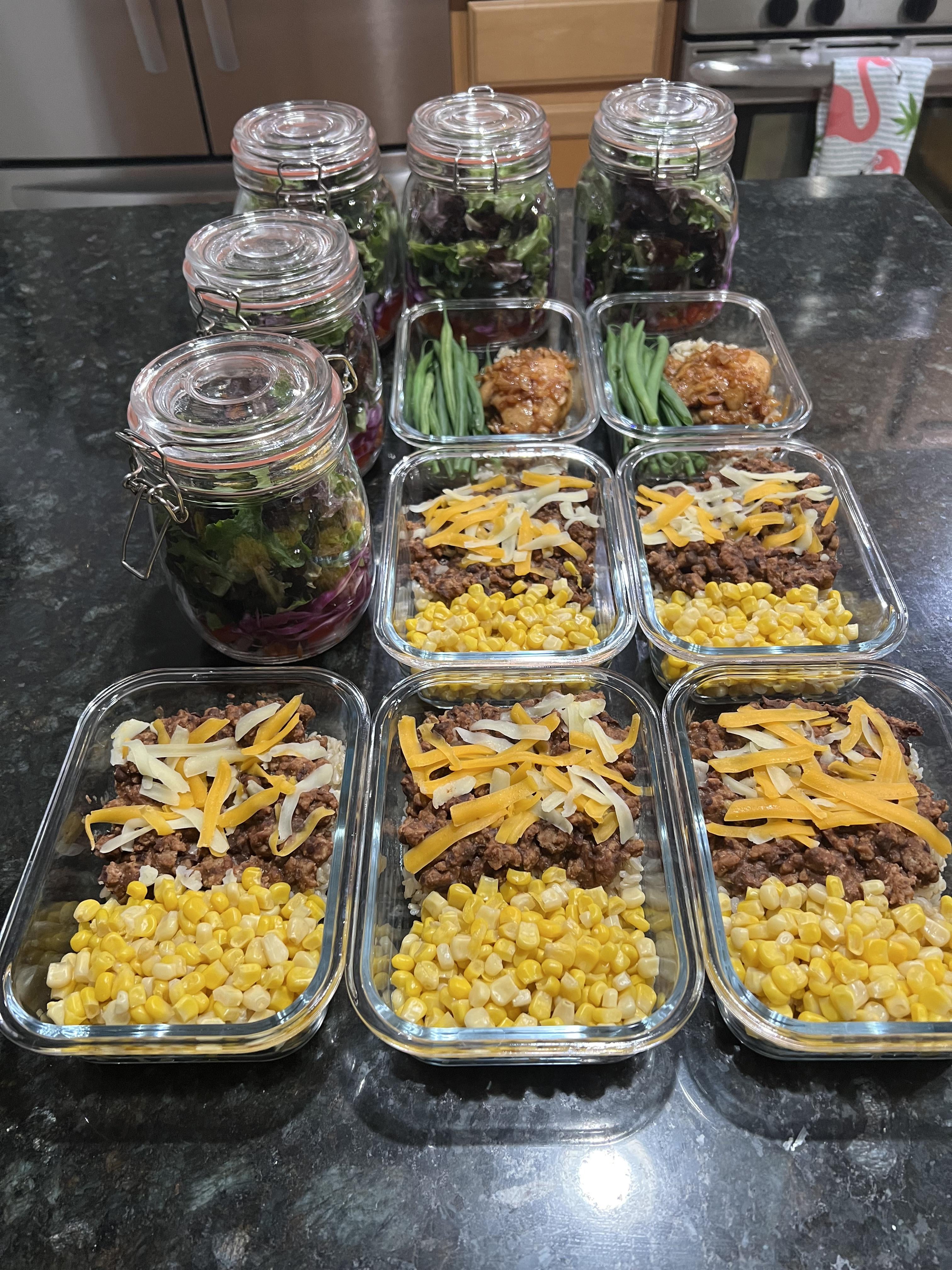 You all have inspired me! Roast chicken thighs with brown rice and green beans (left over from dinner), spicy ground turkey with black bean dip over brown rice with corn and salads for lunch.
