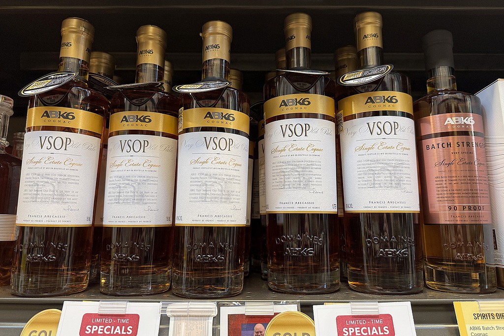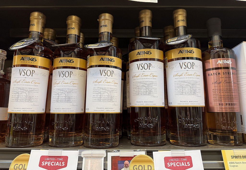 Bottles of French-made cognac are displayed on a shelf at a Total Wine and More store on March 13, 2025 in Corte Madera, California. [Photo/VCG]