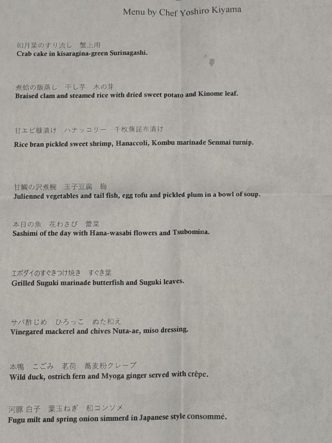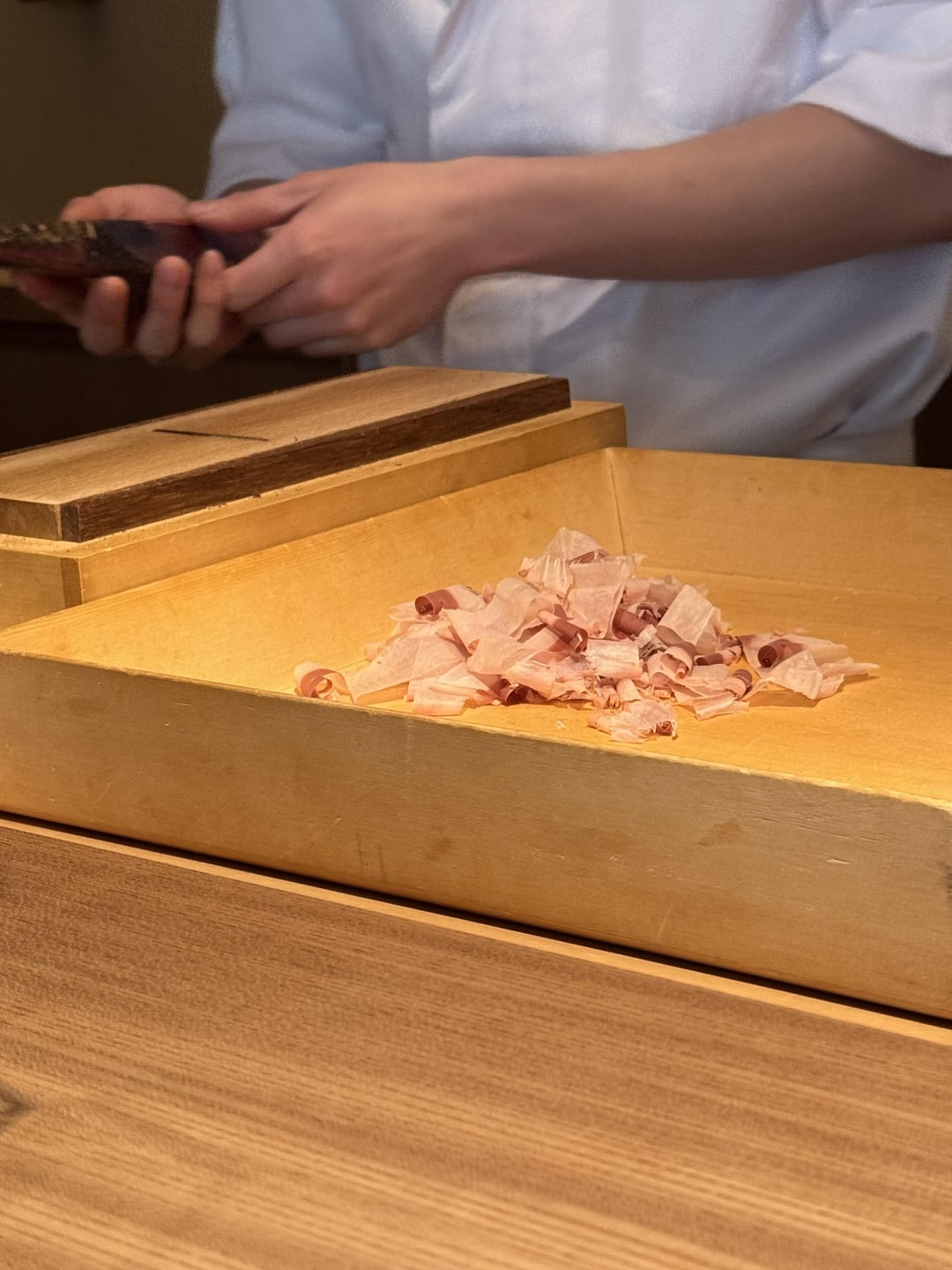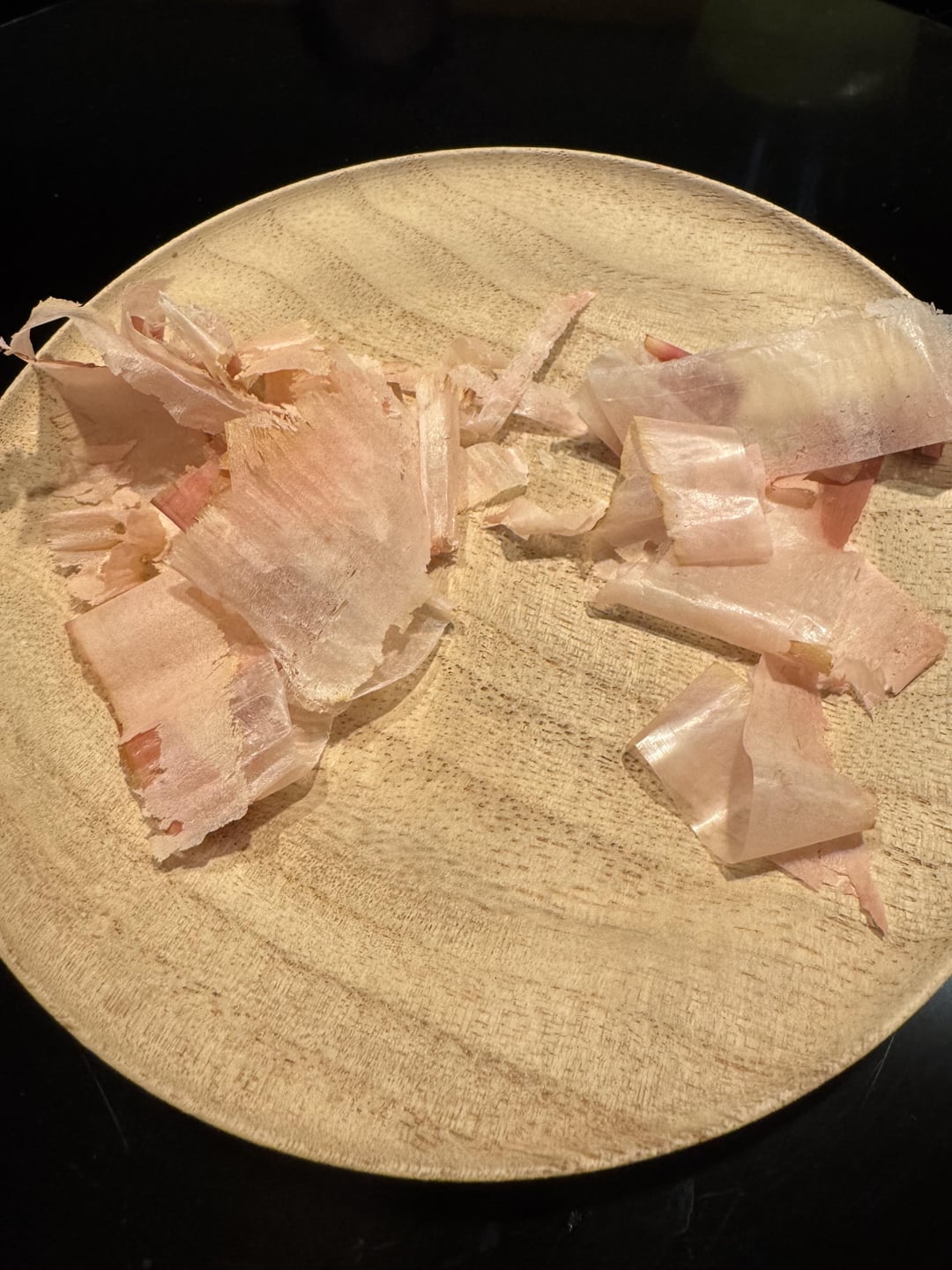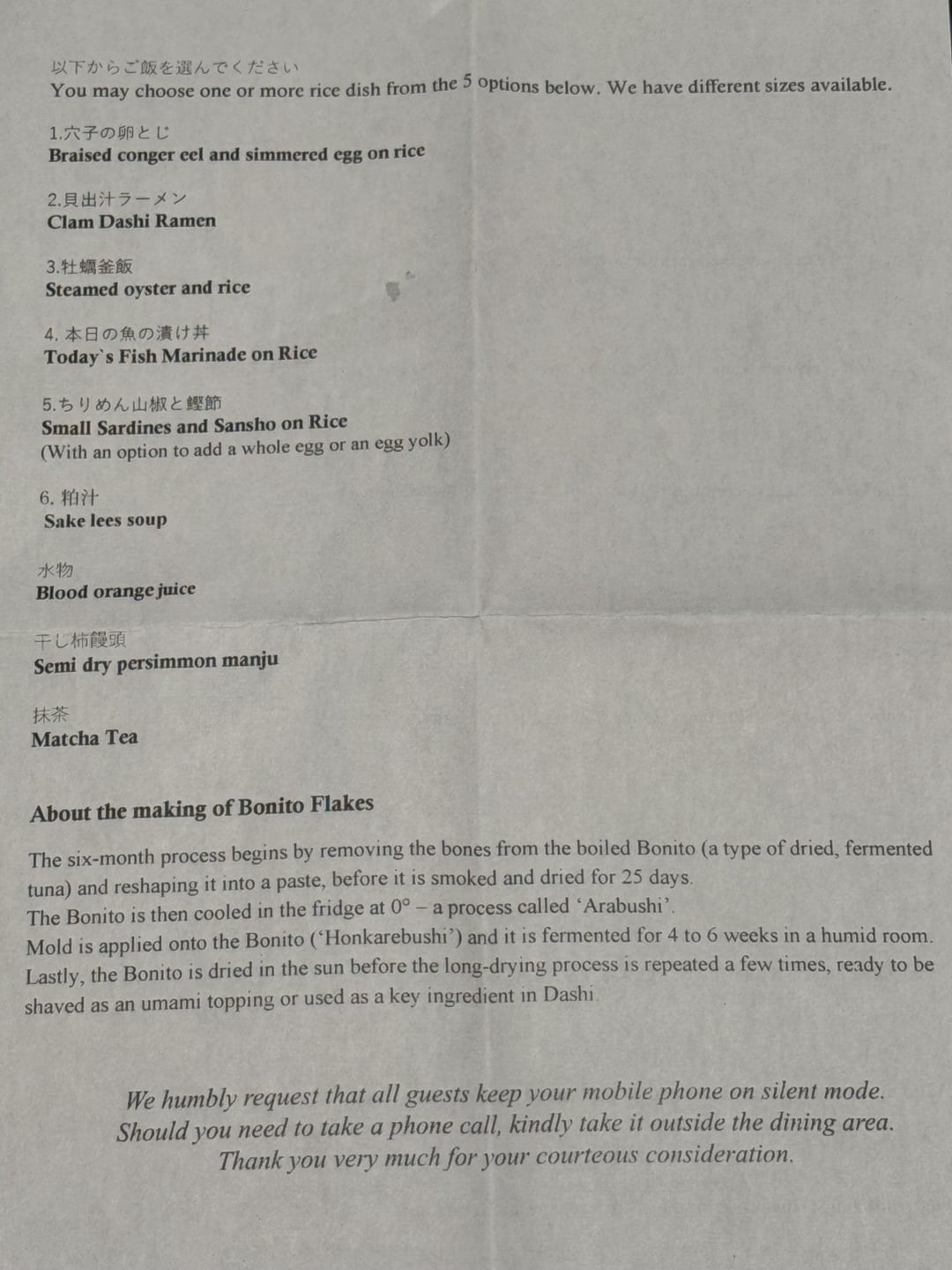 The entire meal took slightly more than 2.5 hours but it did not feel long. The meal was well paced and I enjoyed the whole show of seeing the bonito being shaved and made into dashi behind the counter. Service was excellent and the staff took care of us really well (and were able to accomodate my pregnant wife). They were also able to explain all dishes in English. The atmosphere and vibe of the restaurant was unexpectedly very warm and homely, and I think the large part of this is due to Kiyama-san's personality. He is such a friendly and jovial chefs, always smiling and laughing with the guest.