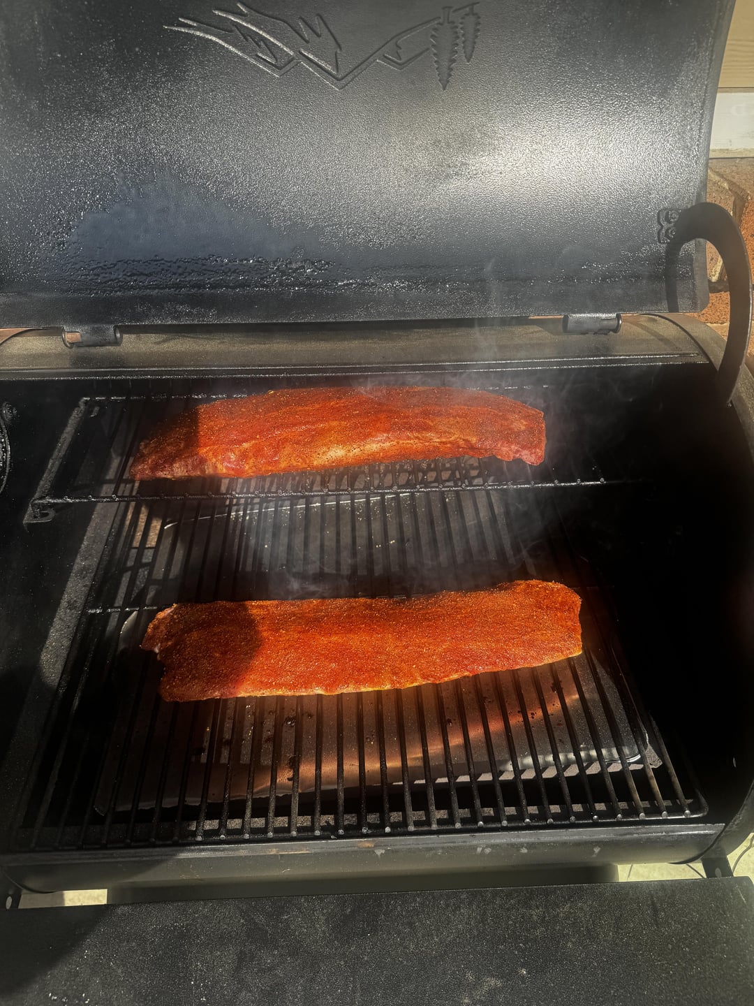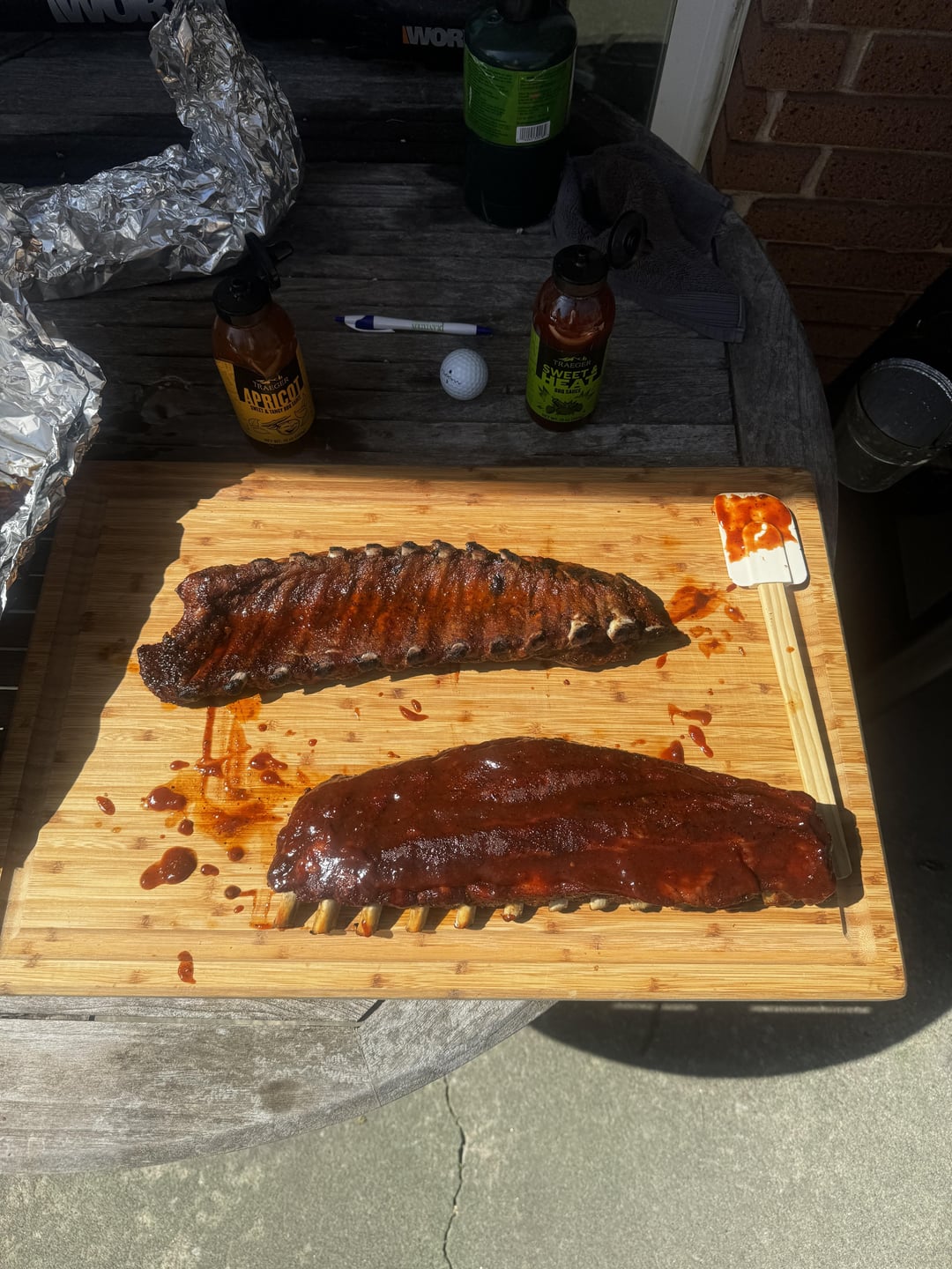 Sauced with Traeger sweet heat bbq and Traeger apricot bbq sauce. They’re actually pretty good and always on sale at my Kroger.