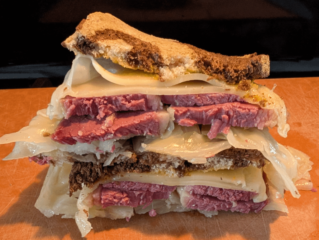 What an awesome next day meal. Everything still fresh and delicious, in a corned beef, cabbage and swiss piled-high sandwich.