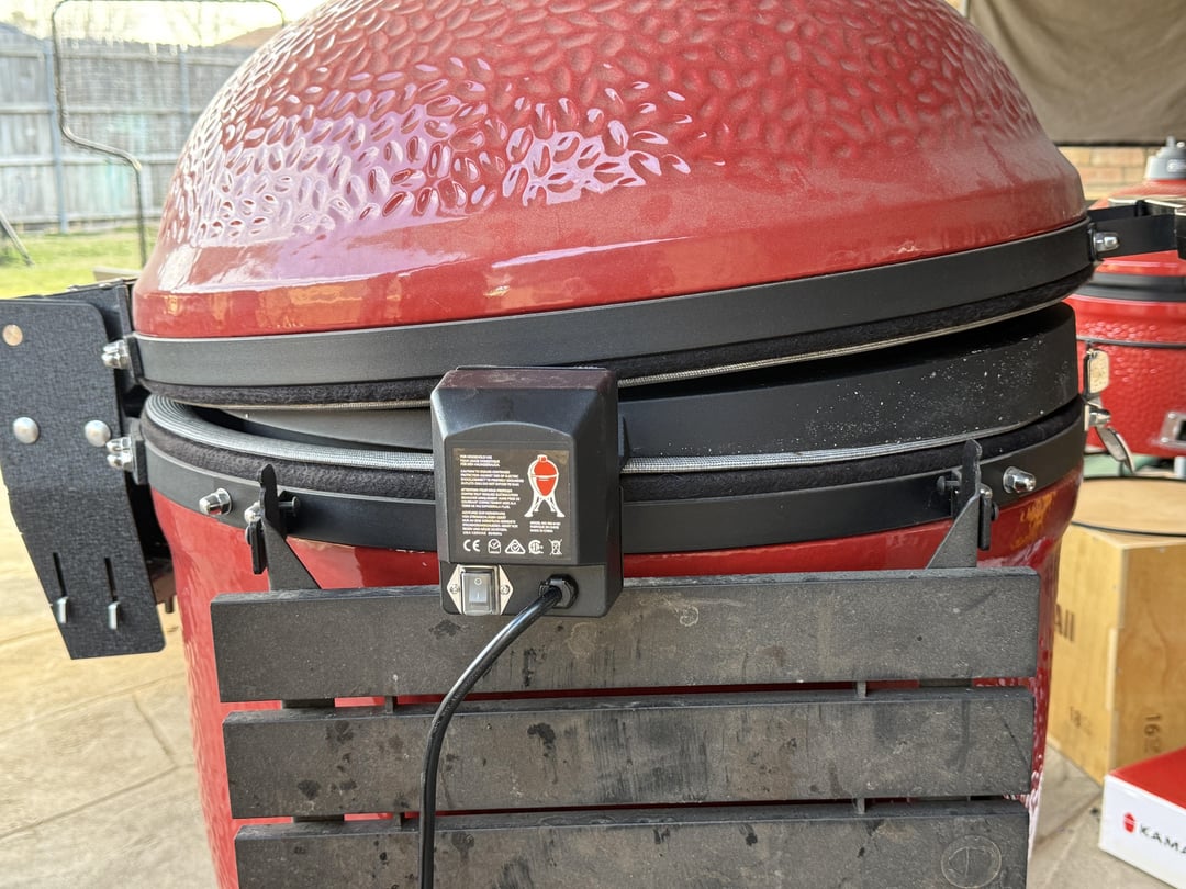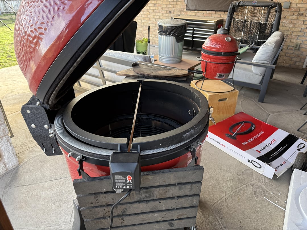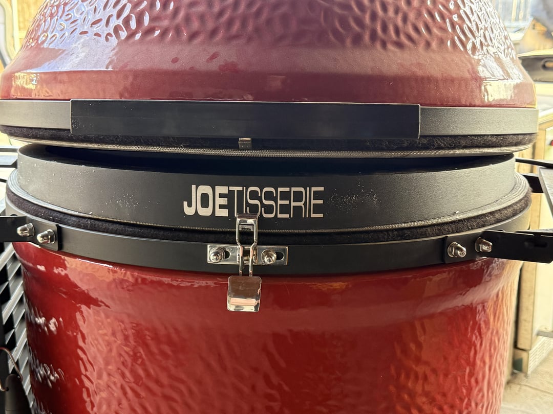 In my experience, you need to put the back of the Joetisserie in front of the rack divider on the Flexible Cooking Rack. It’s too far back.