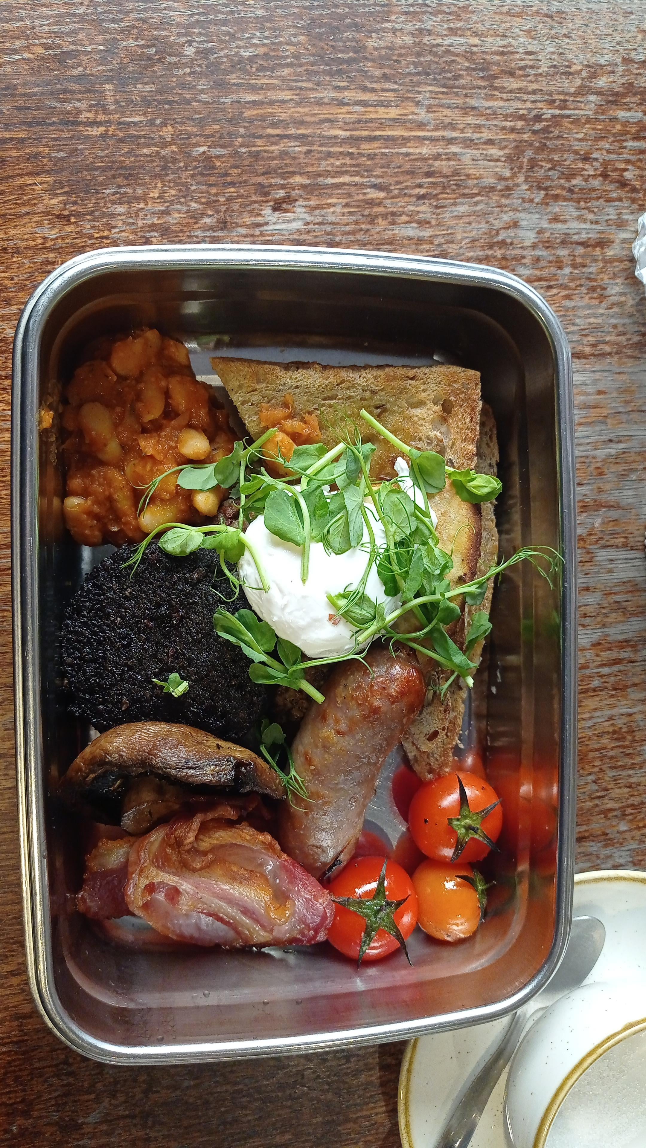 17.95, but astounding quality in the Edinburgh Larder just off Royal Mile. Homemade beans, haggis under the black pud. The best sourdough and lovely tattie scone. Wasn't heavy, price was, but sublime. In a large tiffin box as they make it in the other sister cafe 2 doors down. Not including matcha or my tea. Honestly, don't scoff at the price.