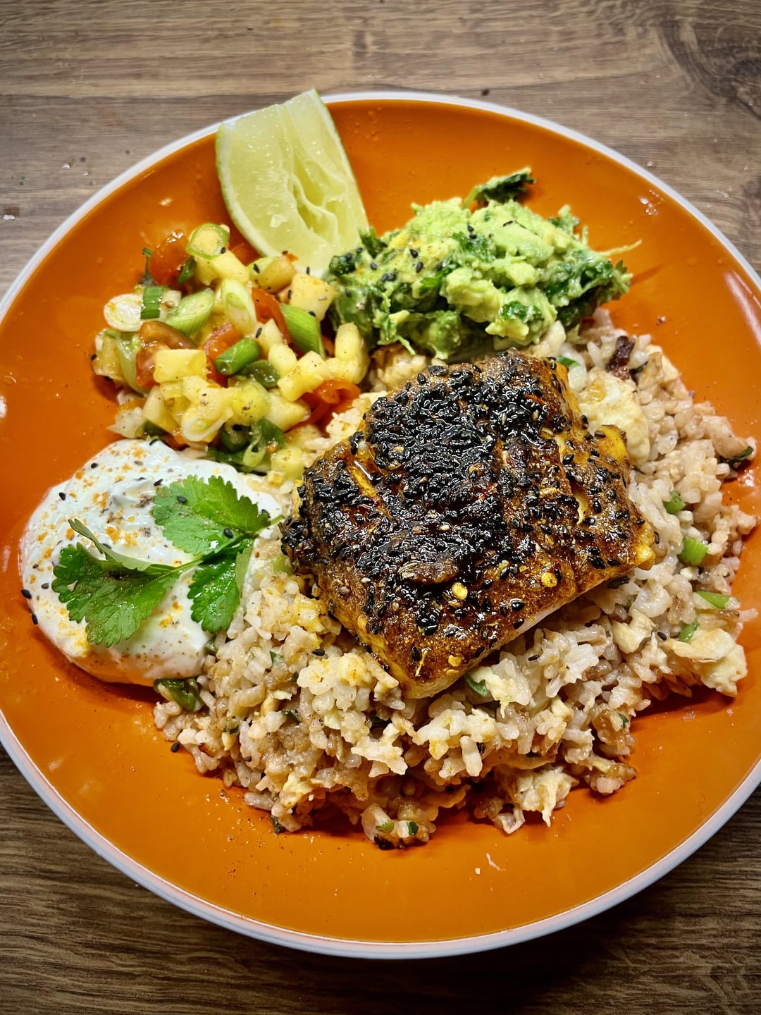 Blackened cod on egg fried rice with creamy coriander guacamole, hot pineapple salsa (fiery orange habanero kicking it) and sour cream to attempt to cool my mouth down…