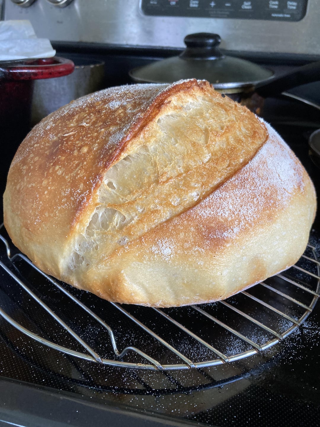 bake the next morning @450 w/ dutch oven lid on. bake for 10min @400 w/o lid